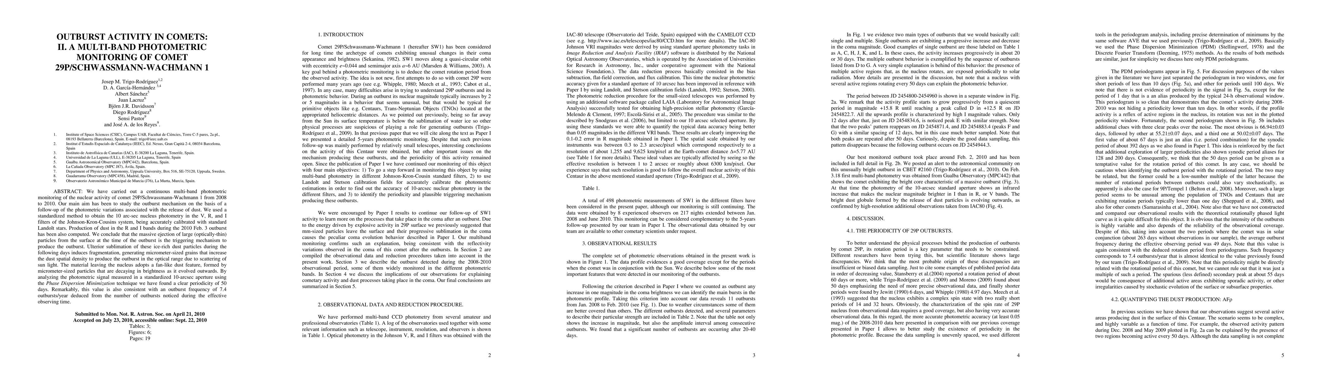 A team monitored comet 29P/Schwassmann-Wachmann 1's outbursts from 2008-2010, finding that massive dust ejections trigger the outburst, with subsequent sublimation causing fragmentation and scattering of sunlight to produce the outburst.
