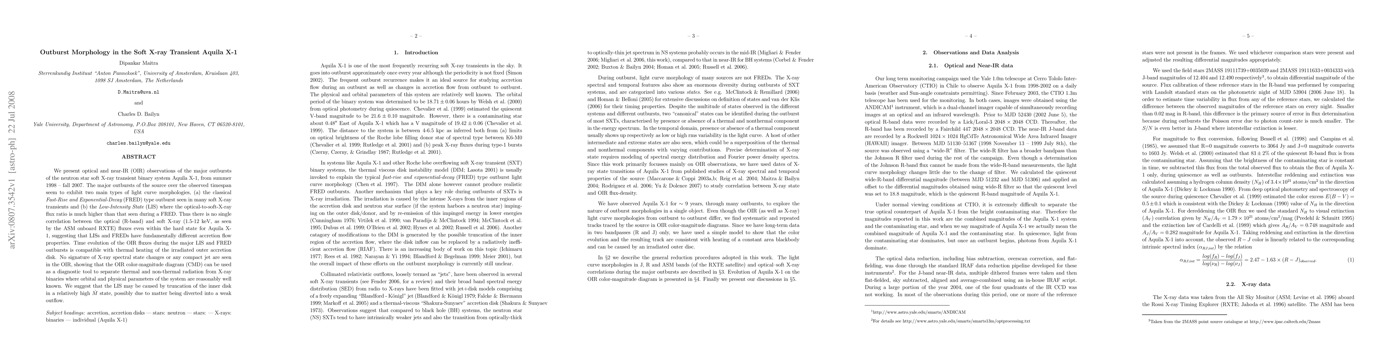 This study analyzes optical and near-IR observations of Aquila X-1's major outbursts from 1998 to 2007, identifying two main light curve morphologies: the Fast-Rise and Exponential-Decay type and the Low-Intensity State. The findings suggest different accretion flow properties for these types, with the optical-to-soft X-ray flux ratio differing significantly, indicating the utility of the optical/near-IR color-magnitude diagram in distinguishing radiation types.