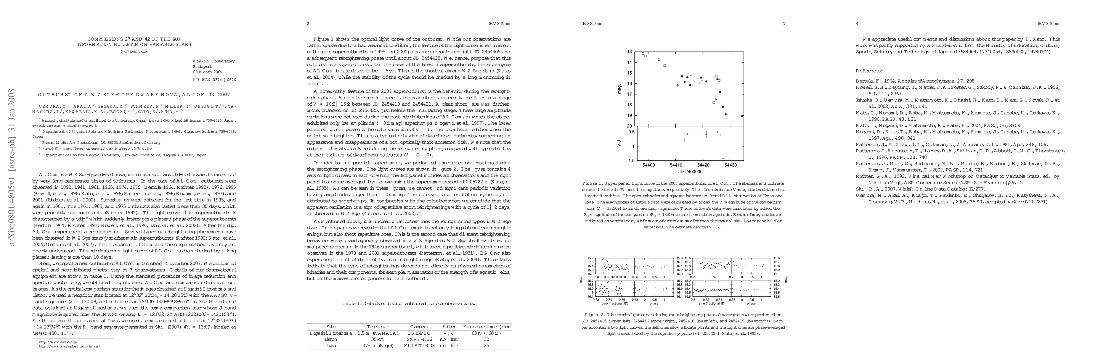 We report photometric observations of AL Com during its rare outburst in 2007. The light curve is reminiscent of its past superoutbursts in 1995 and 2001, except for the rebrightening phase after the main superoutburst. During the rebrightening phase in 2007, we found clear modulations between V=16.2-15.2. In conjunction with the lack of prominent superhumps in our time-series observations, the modulations can most naturally be interpreted as repetitive short rebrightenings with a cycle of 1-2 days. The rebrightening characteristics in 2007 are different from those in 1995 and 2001. This indicates that the type of rebrightenings in WZ Sge stars depends not on binary parameters of objects, but on the mass-accretion process for each outburst.