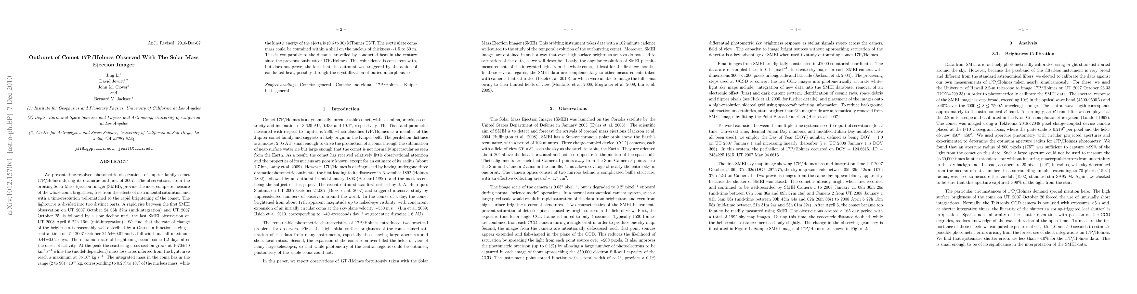 We present time-resolved photometric observations of Jupiter family comet 17P/Holmes during its dramatic outburst of 2007. The observations, from the orbiting Solar Mass Ejection Imager (SMEI), provide the most complete measure of the whole-coma brightness, free from the effects of instrumental saturation and with a time-resolution well-matched to the rapid brightening of the comet. The lightcurve is divided into two distinct parts. A rapid rise between the first SMEI observation on UT 2007 October 24 06h 37m (mid-integration) and UT 2007 October 25, is followed by a slow decline until the last SMEI observation on UT 2008 April 6 22h 16m (mid-integration). We find that the rate of change of the brightness is reasonably well-described by a Gaussian function having a central time of UT 2007 October 24.54+/-0.01 and a full-width-at-half-maximum 0.44+/-0.02 days. The maximum rate of brightening occurs some 1.2 days after the onset of activity. At the peak the scattering cross-section grows at 1070+/-40 km^2/s while the (model-dependent) mass loss rates inferred from the lightcurve reach a maximum at 3+/-10^5 kg/s. The integrated mass in the coma lies in the range (2 to 90)x10^10 kg, corresponding to 0.2% to 10% of the nucleus mass, while the kinetic energy of the ejecta is (0.6 to 30) MTonnes TNT. The particulate coma mass could be contained within a shell on the nucleus of thickness ~1.5 to 60 m. This is comparable to the distance traveled by conducted heat in the century since the previous outburst of 17P/Holmes. This coincidence is consistent with, but does not prove, the idea that the outburst was triggered by the action of conducted heat, possibly through the crystallization of buried amorphous ice.