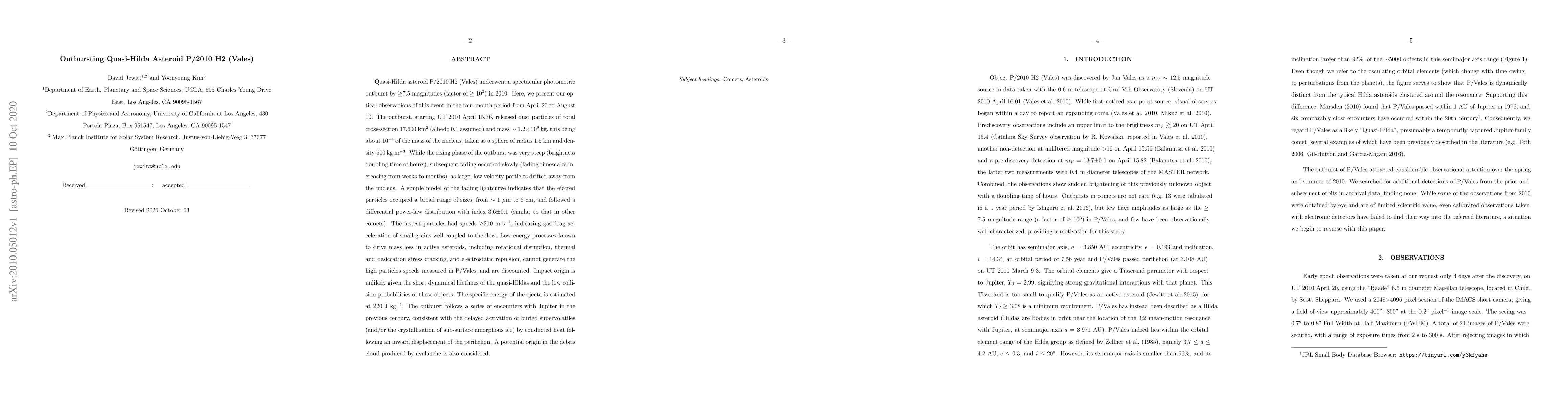 Quasi-Hilda asteroid P/2010 H2 underwent a 7.5 magnitude outburst, releasing dust particles with speeds of up to 210 m/s, suggesting gas-drag acceleration or other high-energy processes.