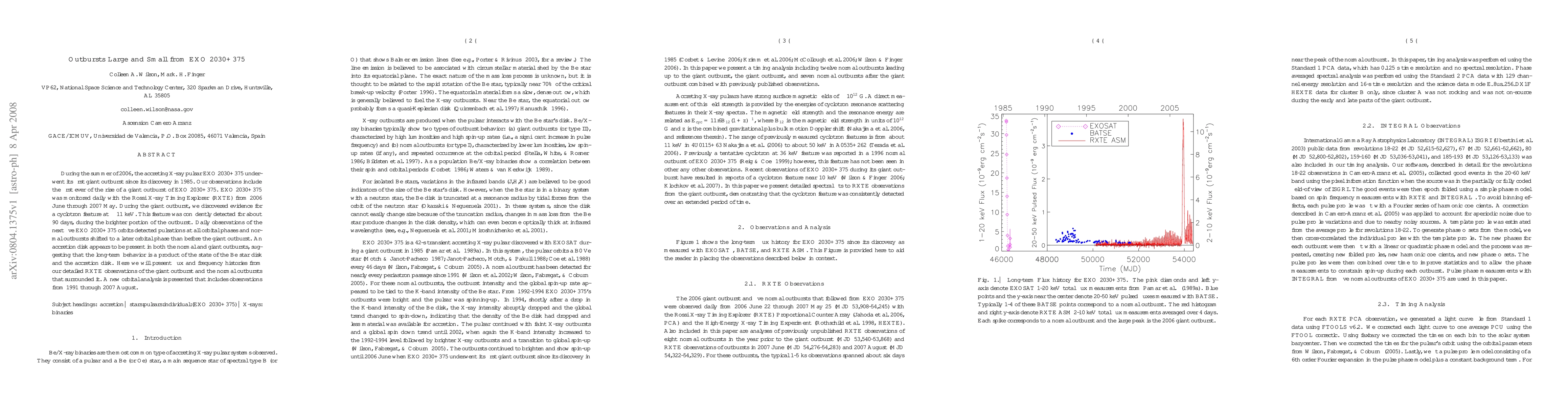 During the summer of 2006, the accreting X-ray pulsar EXO 2030+375 underwent its first giant outburst since its discovery in 1985. Our observations include the first ever of the rise of a giant outburst of EXO 2030+375. EXO 2030+375 was monitored daily with the Rossi X-ray Timing Explorer (RXTE) from 2006 June through 2007 May. During the giant outburst, we discovered evidence for a cyclotron feature at ~11 keV. This feature was confidently detected for about 90 days, during the brighter portion of the outburst. Daily observations of the next five EXO 2030+375 orbits detected pulsations at all orbital phases and normal outbursts shifted to a later orbital phase than before the giant outburst. An accretion disk appears to be present in both the normal and giant outbursts, suggesting that the long-term behavior is a product of the state of the Be star disk and the accretion disk. Here we will present flux and frequency histories from our detailed RXTE observations of the giant outburst and the normal outbursts that surrounded it. A new orbital analysis is presented that includes observations from 1991 through 2007 August.