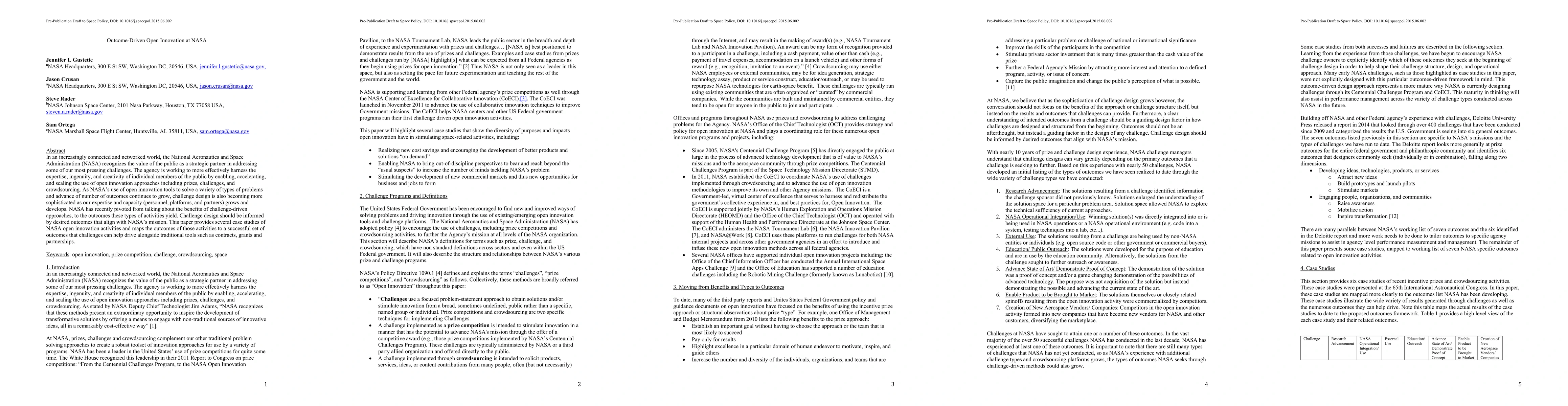 This paper explores NASA's adoption of open innovation to leverage public expertise for solving complex challenges, detailing how challenge design now focuses on desired outcomes aligned with the agency's mission. It presents case studies mapping the outcomes of open innovation activities to successful results alongside traditional methods.