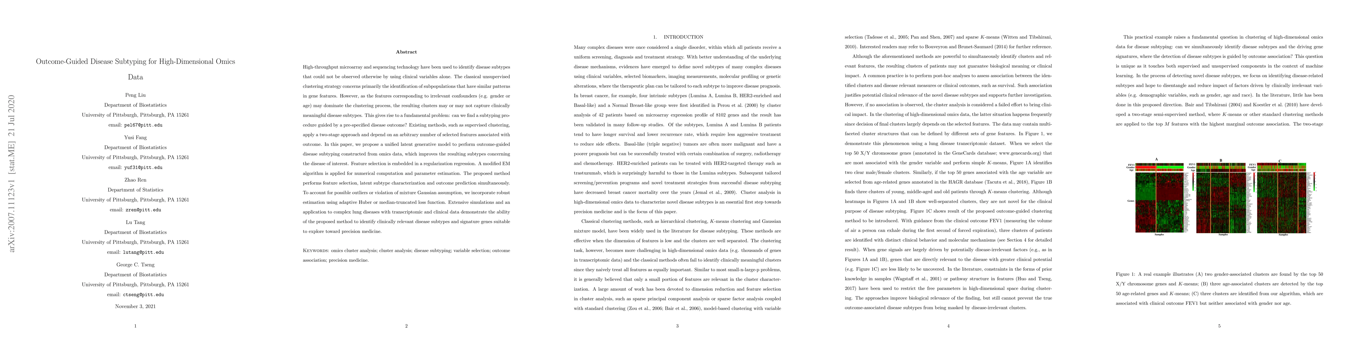 This paper proposes a novel latent generative model for outcome-guided disease subtyping from high-dimensional omics data, integrating feature selection and subtype characterization within a unified framework. The method employs a modified EM algorithm and robust estimation to identify clinically meaningful disease subtypes, demonstrated through simulations and an application to lung disease data.