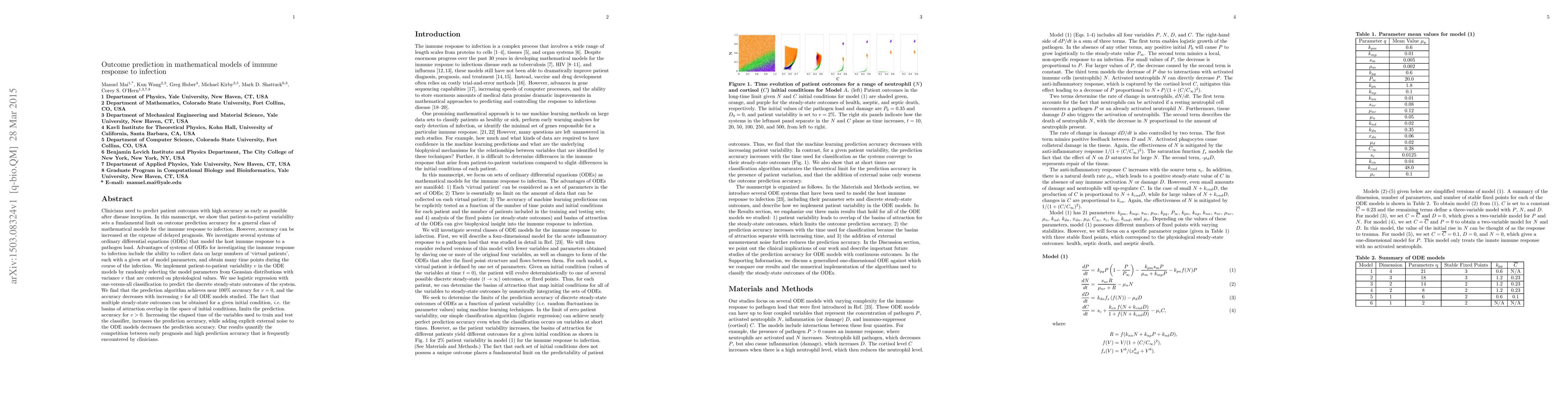 Clinicians need to predict patient outcomes with high accuracy as early as possible after disease inception. In this manuscript, we show that patient-to-patient variability sets a fundamental limit on outcome prediction accuracy for a general class of mathematical models for the immune response to infection. However, accuracy can be increased at the expense of delayed prognosis. We investigate several systems of ordinary differential equations (ODEs) that model the host immune response to a pathogen load. Advantages of systems of ODEs for investigating the immune response to infection include the ability to collect data on large numbers of `virtual patients', each with a given set of model parameters, and obtain many time points during the course of the infection. We implement patient-to-patient variability $v$ in the ODE models by randomly selecting the model parameters from Gaussian distributions with variance $v$ that are centered on physiological values. We use logistic regression with one-versus-all classification to predict the discrete steady-state outcomes of the system. We find that the prediction algorithm achieves near $100\%$ accuracy for $v=0$, and the accuracy decreases with increasing $v$ for all ODE models studied. The fact that multiple steady-state outcomes can be obtained for a given initial condition, i.e. the basins of attraction overlap in the space of initial conditions, limits the prediction accuracy for $v>0$. Increasing the elapsed time of the variables used to train and test the classifier, increases the prediction accuracy, while adding explicit external noise to the ODE models decreases the prediction accuracy. Our results quantify the competition between early prognosis and high prediction accuracy that is frequently encountered by clinicians.
