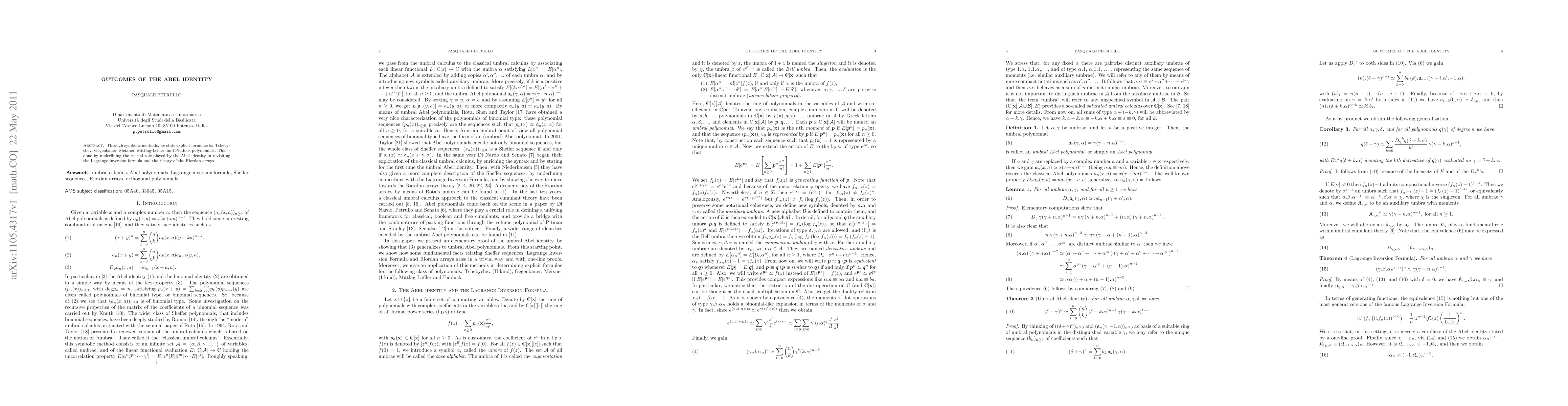 Through symbolic methods, we state explicit formulae for Tchebychev, Gegenbauer, Meixner, Mittlag-Leffler, and Pidduck polynomials. This is done by underlining the crucial role played by the Abel identity in revisiting the Lagrange inversion formula and the theory of the Riordan arrays.