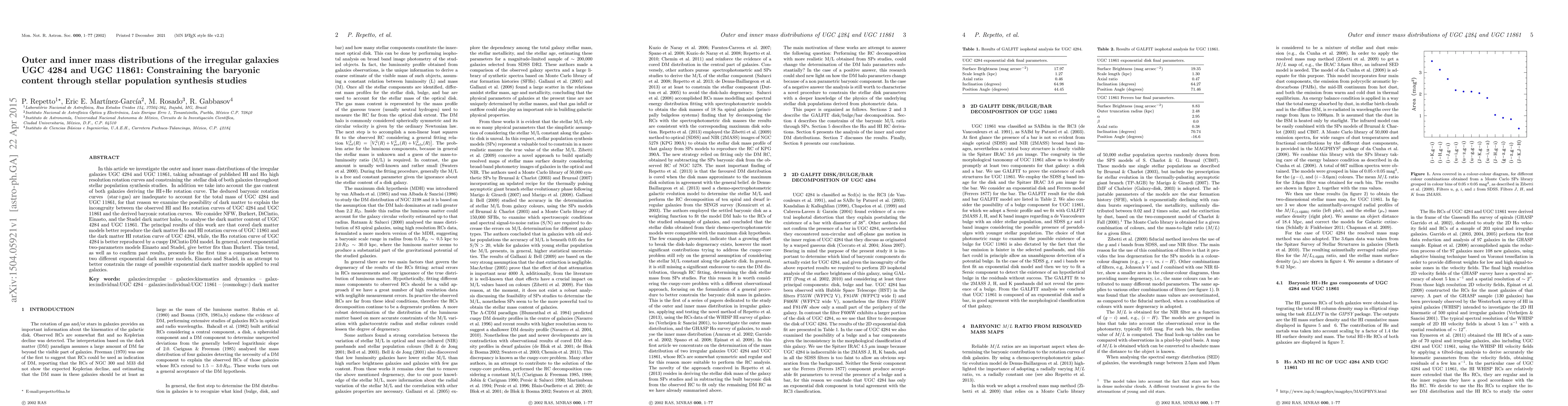 In this article we investigate the outer and inner mass distributions of the irregular galaxies UGC 4284 and UGC 11861, taking advantage of published HI and H{\alpha} high resolution rotation curves and constraining the stellar disk of both galaxies throughout stellar population synthesis studies. In addition we take into account the gas content of both galaxies deriving the HI+He rotation curve. The deduced baryonic rotation curves (star+gas) are inadequate to account for the total mass of UGC 4284 and UGC 11861, for that reason we examine the possibility of dark matter to explain the incongruity between the observed HI and H{\alpha} rotation curves of UGC 4284 and UGC 11861 and the derived baryonic rotation curves. We consider NFW, Burkert, DiCintio, Einasto, and the Stadel dark matter halos, to analyse the dark matter content of UGC 4284 and UGC 11861. The principal results of this work are that cored dark matter models better reproduce the dark matter H{\alpha} and HI rotation curves of UGC 11861 and the dark matter HI rotation curve of UGC 4284, while, the H{\alpha} rotation curve of UGC 4284 is better reproduced by a cuspy DiCintio DM model. In general, cored exponential two-parameters models Einasto and Stadel, give better fits than Burkert. This trend, as well as to confirm past results, presents for the first time a comparison between two different exponential dark matter models, Einasto and Stadel, in an attempt to better constrain the range of possible exponential dark matter models applied to real galaxies.