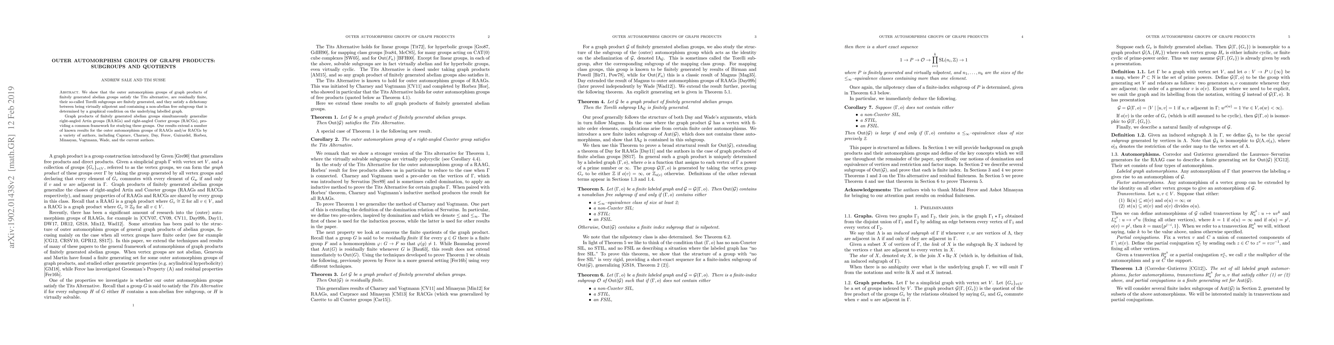 We show that the outer automorphism groups of graph products of finitely generated abelian groups satisfy the Tits alternative, are residually finite, their so-called Torelli subgroups are finitely generated, and they satisfy a dichotomy between being virtually nilpotent and containing a non-abelian free subgroup that is determined by a graphical condition on the underlying labelled graph. Graph products of finitely generated abelian groups simultaneously generalize right-angled Artin groups (RAAGs) and right-angled Coxter groups (RACGs), providing a common framework for studying these groups. Our results extend a number of known results for the outer automorphism groups of RAAGs and/or RACGs by a variety of authors, including Caprace, Charney, Day, Ferov, Guirardel, Horbez, Minasyan, Vogtmann, Wade, and the current authors.