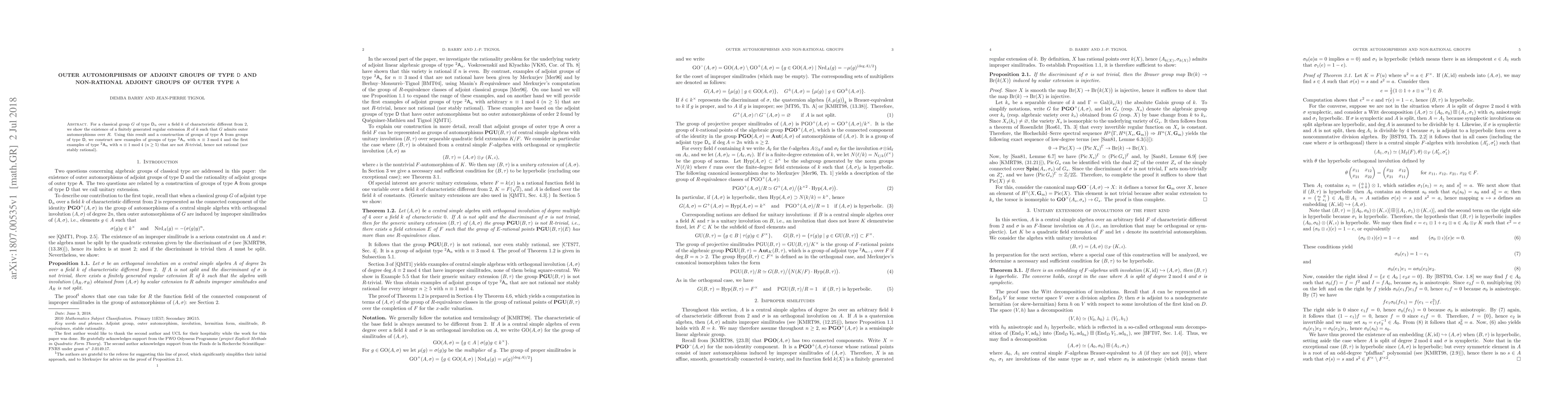 Summary: The paper demonstrates the existence of outer automorphisms for classical groups of type D over a non-characteristic 2 field, and uses this to construct non-rational groups of type $^2\mathsf A_n$ for specific values of n, providing new examples of non-$R$-trivial adjoint groups.