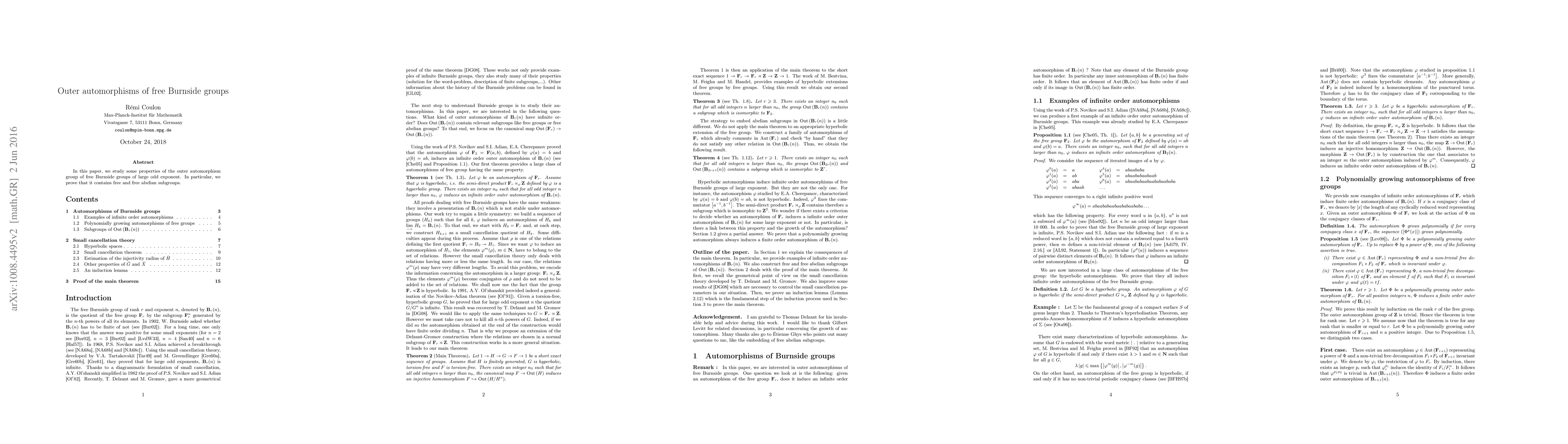 Summary: This paper investigates the outer automorphism group of free Burnside groups with large odd exponents, demonstrating the existence of free and free abelian subgroups within it.