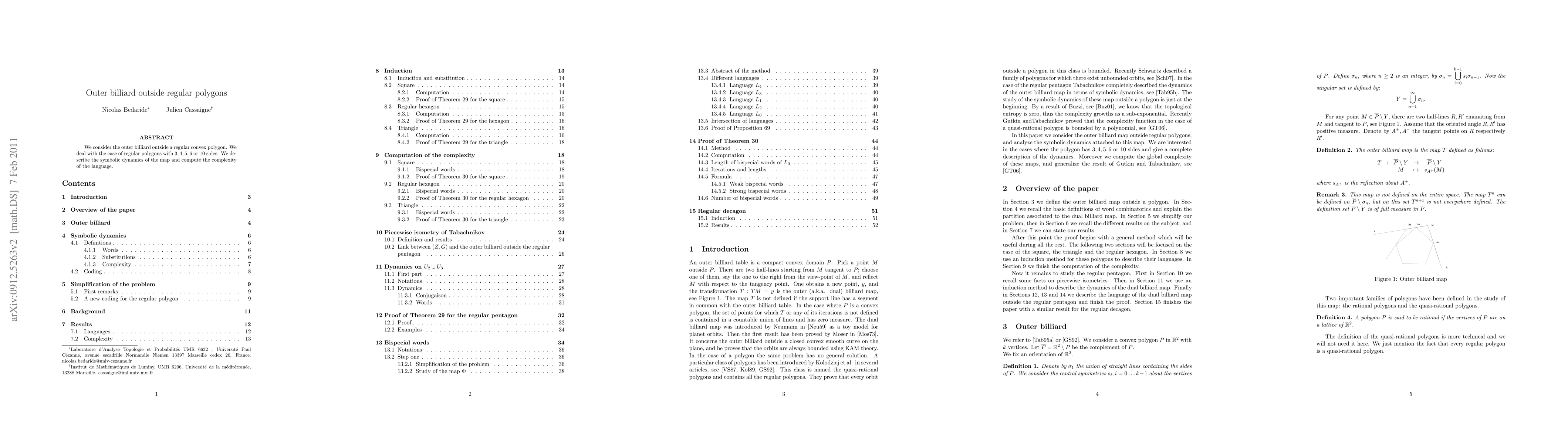 This paper studies the outer billiard dynamics outside regular convex polygons with 3, 4, 5, 6, and 10 sides, analyzing the symbolic dynamics and calculating the complexity of the resulting language.
