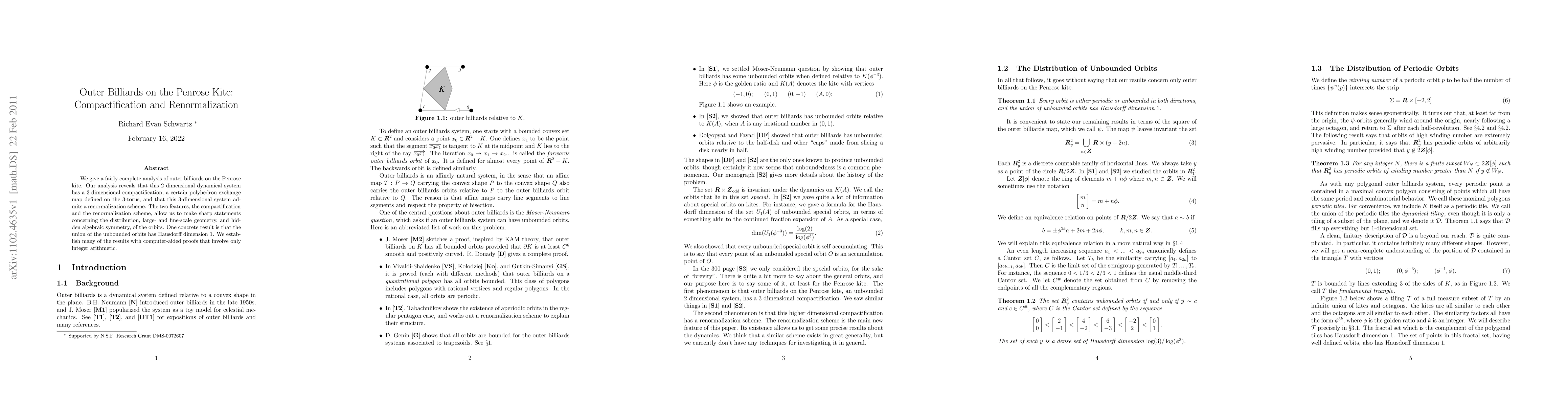 In this long paper we give a fairly complete analysis of outer billiards on the Penrose kite. Our analysis reveals that this 2-dimensional non-compact system has a 3-dimensional compactification, a certain polyhedron exchange map, and that this compactification has a renormalization scheme. These two features allow us to make some sharp statements concerning the distribution, large-scale geometry, fine-scale geometry, and hidden algebraic symmetries of the orbits. For instance, one of our results is that the union of the unbounded orbits has Hausdorff dimension 1. We give a computer-aided proof of the results concerning the compactification and the renormalization. This proof involves finitely many calculations done with exact integer arithmetic.