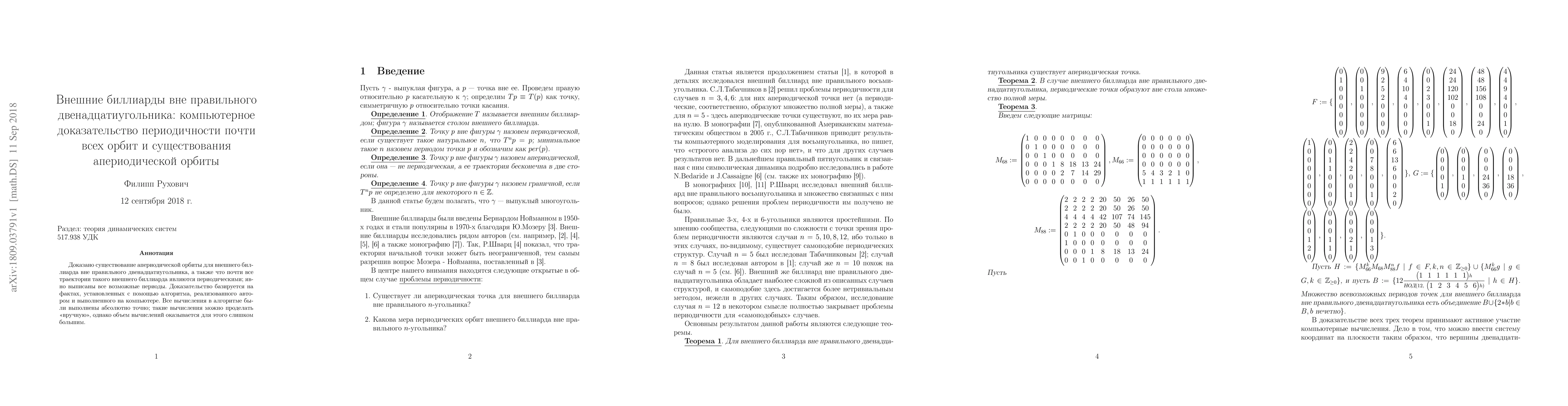 An existence of an aperiodic point for outer billiard outside regular dodecagon is proved. Additionally, almost all orbits of such an outer billiard are proved to be periodic, and all possible periods are listed explicitly. The proof is based on facts established with computer program implemented by author. All calculations of a program has been made with absolute accuracy; these calculations can be done "by hands" but it this case, amount of calculations would be too large.