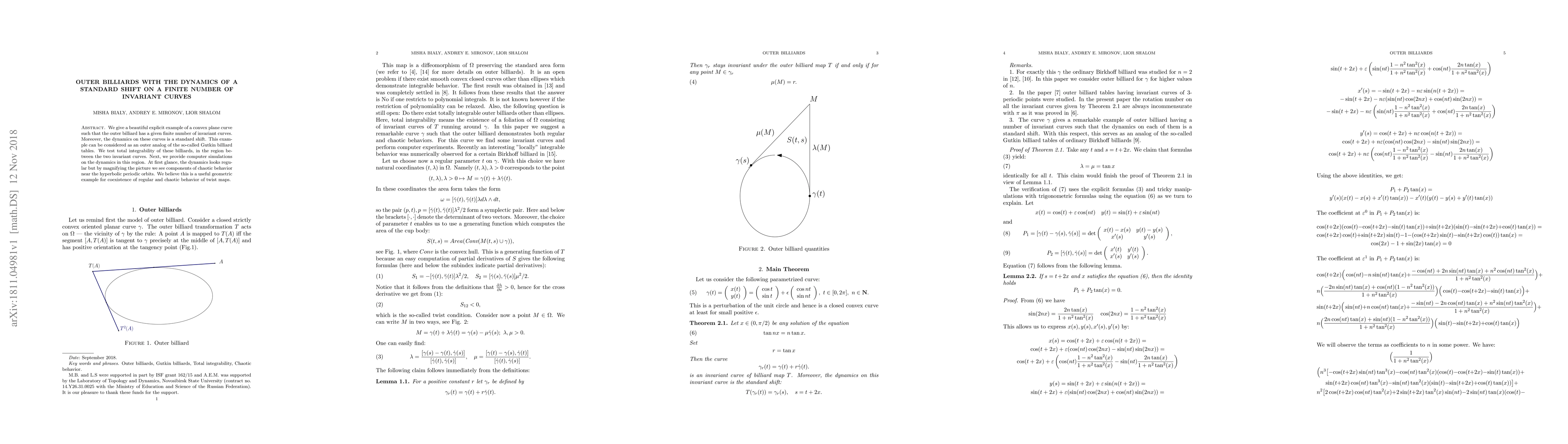 We give a beautiful explicit example of a convex plane curve such that the outer billiard has a given finite number of invariant curves. Moreover, the dynamics on these curves is a standard shift. This example can be considered as an outer analog of the so-called Gutkin billiard tables. We test total integrability of these billiards, in the region between the two invariant curves. Next, we provide computer simulations on the dynamics in this region. At first glance, the dynamics looks regular but by magnifying the picture we see components of chaotic behavior near the hyperbolic periodic orbits. We believe this is a useful geometric example for coexistence of regular and chaotic behavior of twist maps.
