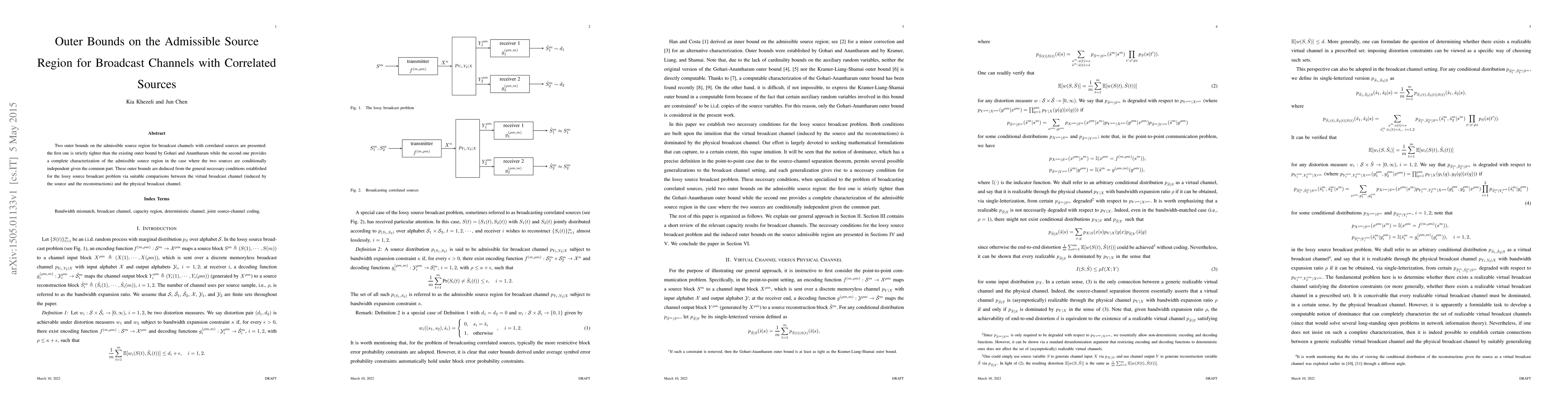 The paper presents two outer bounds on the admissible source region for broadcast channels with correlated sources, derived from necessary conditions for the lossy source broadcast problem by comparing the virtual and physical broadcast channels.