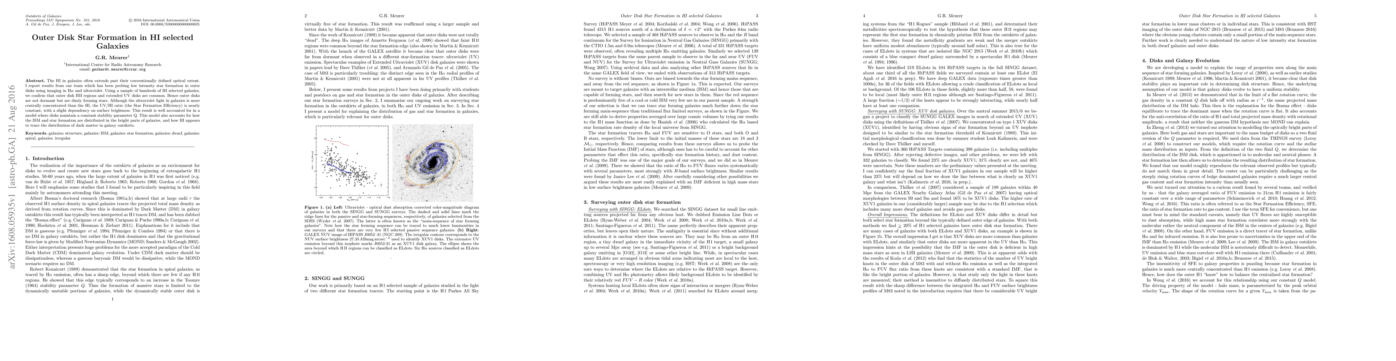 The HI in galaxies often extends past their conventionally defined optical extent. I report results from our team which has been probing low intensity star formation in outer disks using imaging in H-alpha and ultraviolet. Using a sample of hundreds of HI selected galaxies, we confirm that outer disk HII regions and extended UV disks are common. Hence outer disks are not dormant but are dimly forming stars. Although the ultraviolet light in galaxies is more centrally concentrated than the HI, the UV/HI ratio (the Star Formation Efficiency) is nearly constant, with a slight dependency on surface brightness. This result is well accounted for in a model where disks maintain a constant stability parameter Q. This model also accounts for how the ISM and star formation are distributed in the bright parts of galaxies, and how HI appears to trace the distribution of dark matter in galaxy outskirts.
