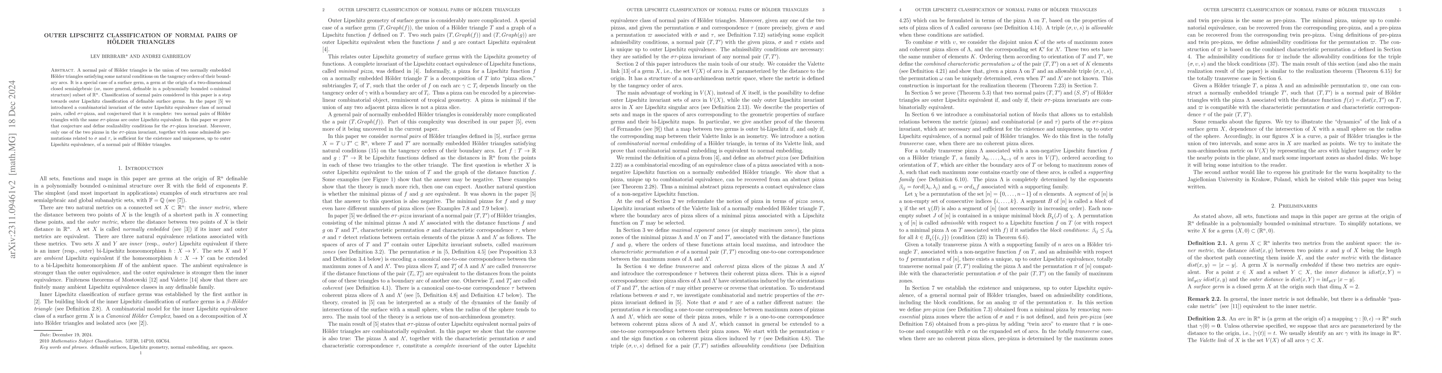 A normal pair of H\"older triangles is the union of two normally embedded H\"older triangles satisfying some natural conditions on the tangency orders of their boundary arcs. It is a special case of a surface germ, a germ at the origin of a two-dimensional closed semialgebraic (or, more general, definable in a polynomially bounded o-minimal structure) subset of $R^n$. Classification of normal pairs considered in this paper is a step towards outer Lipschitz classification of definable surface germs. In the paper \cite{BG} we introduced a combinatorial invariant of the outer Lipschitz equivalence class of normal pairs, called $\sigma\tau$-pizza, and conjectured that it is complete: two normal pairs of H\"older triangles with the same $\sigma\tau$-pizzas are outer Lipschitz equivalent. In this paper we prove that conjecture and define realizability conditions for the $\sigma\tau$-pizza invariant. Moreover, only one of the two pizzas in the $\sigma\tau$-pizza invariant, together with some admissible permutations related to $\sigma$ and $\tau$, is sufficient for the existence and uniqueness, up to outer Lipschitz equivalence, of a normal pair of H\"older triangles.