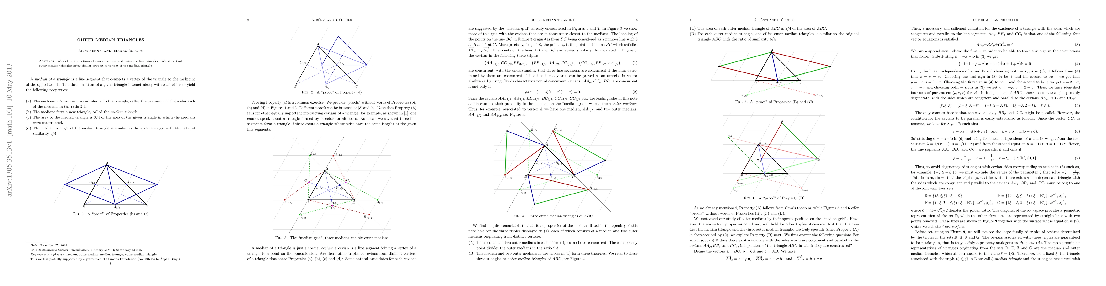 Summary: This paper introduces the concept of outer medians and outer median triangles, demonstrating that these geometric constructs share properties analogous to those of traditional median triangles. The study aims to extend the understanding of median-related properties in triangle geometry.