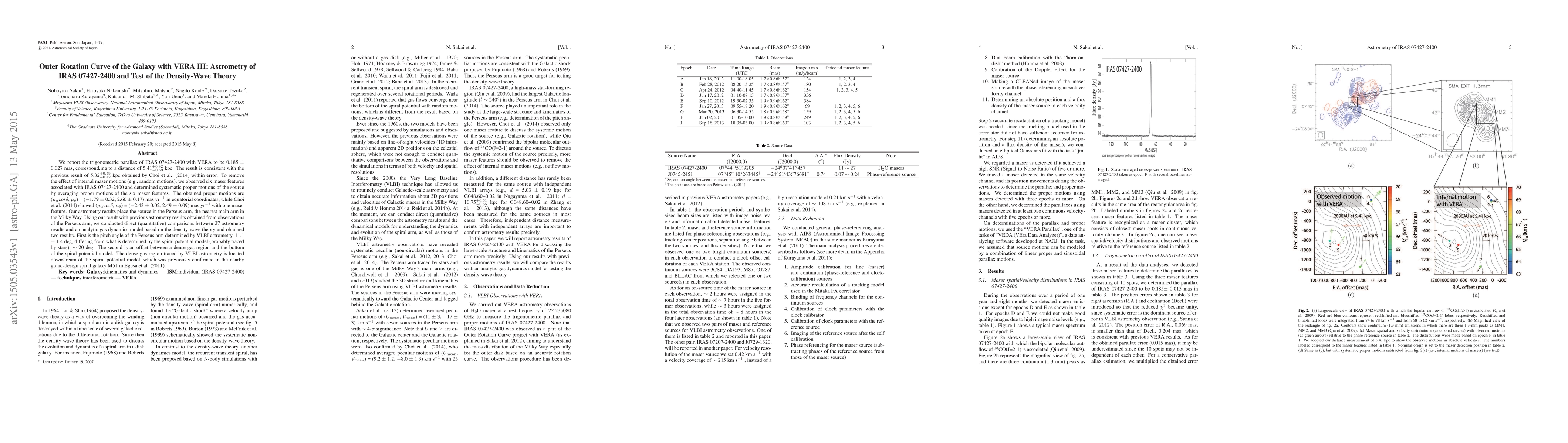 We report the trigonometric parallax of IRAS 07427-2400 with VERA to be 0.185 $\pm$ 0.027 mas, corresponding to a distance of 5.41$^{+0.92}_{-0.69}$ kpc. The result is consistent with the previous result of 5.32$^{+0.49}_{-0.42}$ kpc obtained by Choi et al. (2014) within error. To remove the effect of internal maser motions (e.g., random motions), we observed six maser features associated with IRAS 07427-2400 and determined systematic proper motions of the source by averaging proper motions of the six maser features. The obtained proper motions are ($\mu_{\alpha}$cos$\delta$, $\mu_{\delta}$) = ($-$1.79 $\pm$ 0.32, 2.60 $\pm$ 0.17) mas yr$^{-1}$ in equatorial coordinates, while Choi et al. (2014) showed ($\mu_{\alpha}$cos$\delta$, $\mu_{\delta}$) = ($-$2.43 $\pm$ 0.02, 2.49 $\pm$ 0.09) mas yr$^{-1}$ with one maser feature. Our astrometry results place the source in the Perseus arm, the nearest main arm in the Milky Way. Using our result with previous astrometry results obtained from observations of the Perseus arm, we conducted direct (quantitative) comparisons between 27 astrometry results and an analytic gas dynamics model based on the density-wave theory and obtained two results. First is the pitch angle of the Perseus arm determined by VLBI astrometry, 11.1 $\pm$ 1.4 deg, differing from what is determined by the spiral potential model (probably traced by stars), $\sim$ 20 deg. The second is an offset between a dense gas region and the bottom of the spiral potential model. The dense gas region traced by VLBI astrometry is located downstream of the spiral potential model, which was previously confirmed in the nearby grand-design spiral galaxy M51 in Egusa et al. (2011).