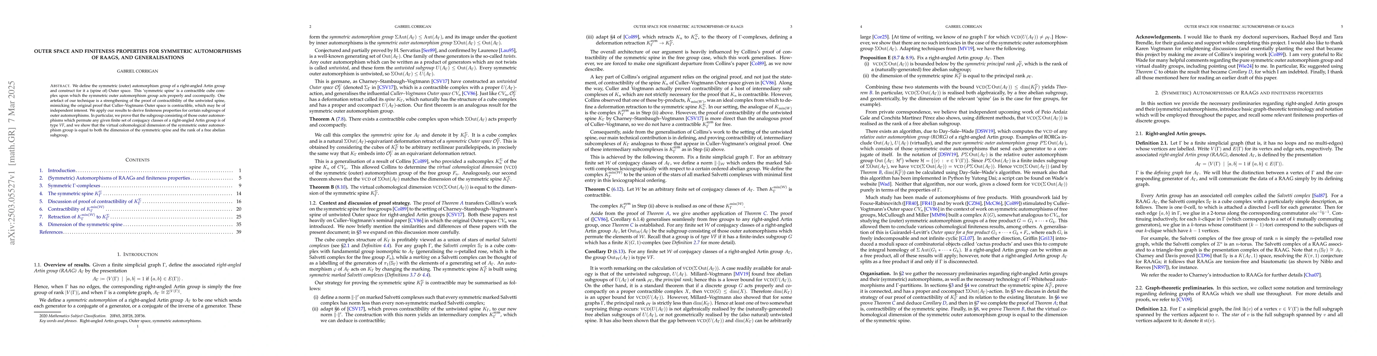 The main novelty lies in the construction of the symmetric spine and the detailed examination of finiteness properties for specific subgroups of outer automorphisms, offering a fresh perspective on the structure of symmetric automorphism groups of RAAGs.