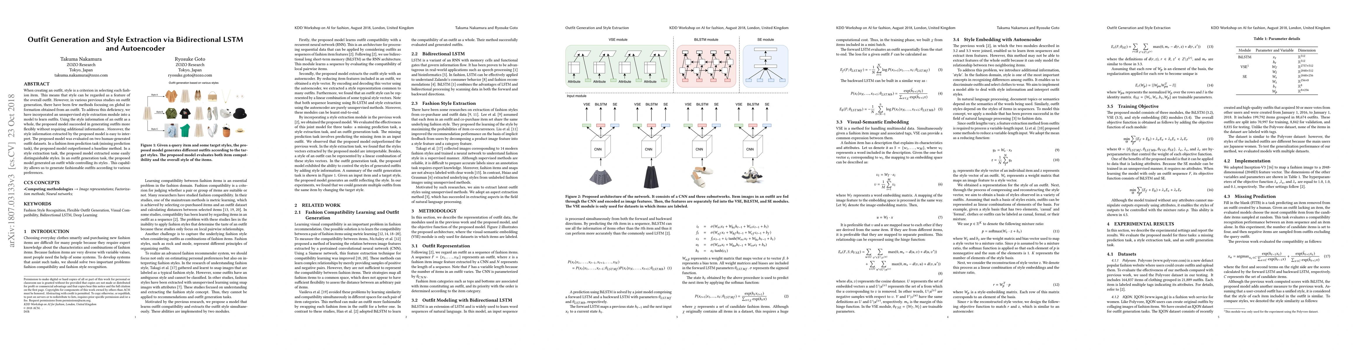 This paper proposes a model combining bidirectional LSTM and autoencoder to generate outfits and extract style features from global outfit information. The model outperforms baselines in fashion item prediction and generates fashionable outfits with controlled styles.