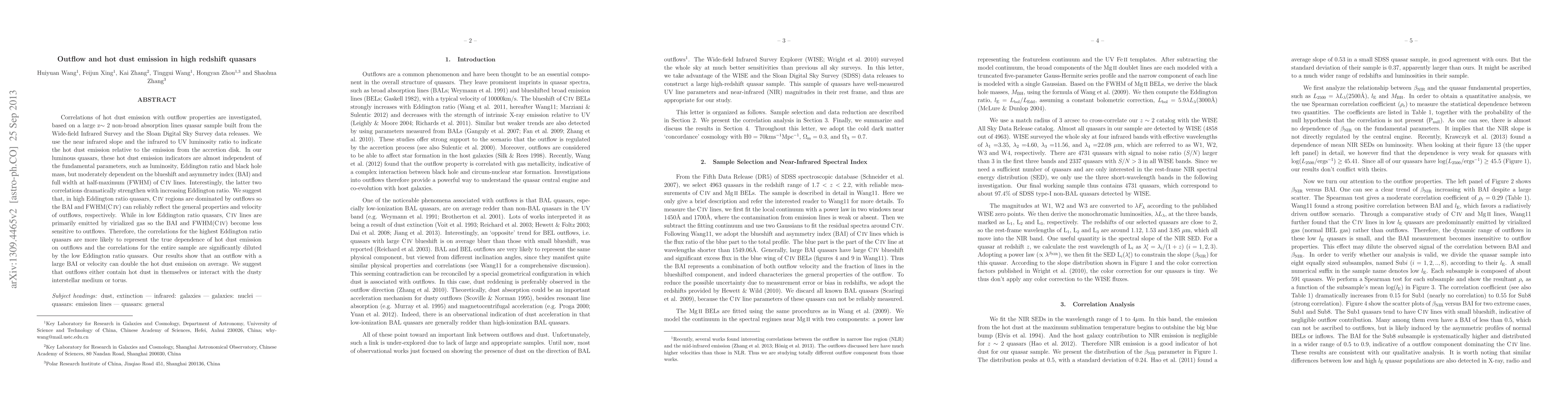 Correlations of hot dust emission with outflow properties are investigated, based on a large z~2 non-broad absorption lines quasar sample built from the Wide-field Infrared Survey and the Sloan Digital Sky Survey data releases. We use the near infrared slope and the infrared to UV luminosity ratio to indicate the hot dust emission relative to the emission from the accretion disk. In our luminous quasars, these hot dust emission indicators are almost independent of the fundamental parameters, such as luminosity, Eddington ratio and black hole mass, but moderately dependent on the blueshift and asymmetry index (BAI) and full width at half-maximum (FWHM) of CIV lines. Interestingly, the latter two correlations dramatically strengthen with increasing Eddington ratio. We suggest that, in high Eddington ratio quasars, CIV regions are dominated by outflows so the BAI and FWHM(CIV) can reliably reflect the general properties and velocity of outflows, respectively. While in low Eddington ratio quasars, CIV lines are primarily emitted by virialized gas so the BAI and FWHM(CIV) become less sensitive to outflows. Therefore, the correlations for the highest Eddington ratio quasars are more likely to represent the true dependence of hot dust emission on outflows and the correlations for the entire sample are significantly diluted by the low Eddington ratio quasars. Our results show that an outflow with a large BAI or velocity can double the hot dust emission on average. We suggest that outflows either contain hot dust in themselves or interact with the dusty interstellar medium or torus.