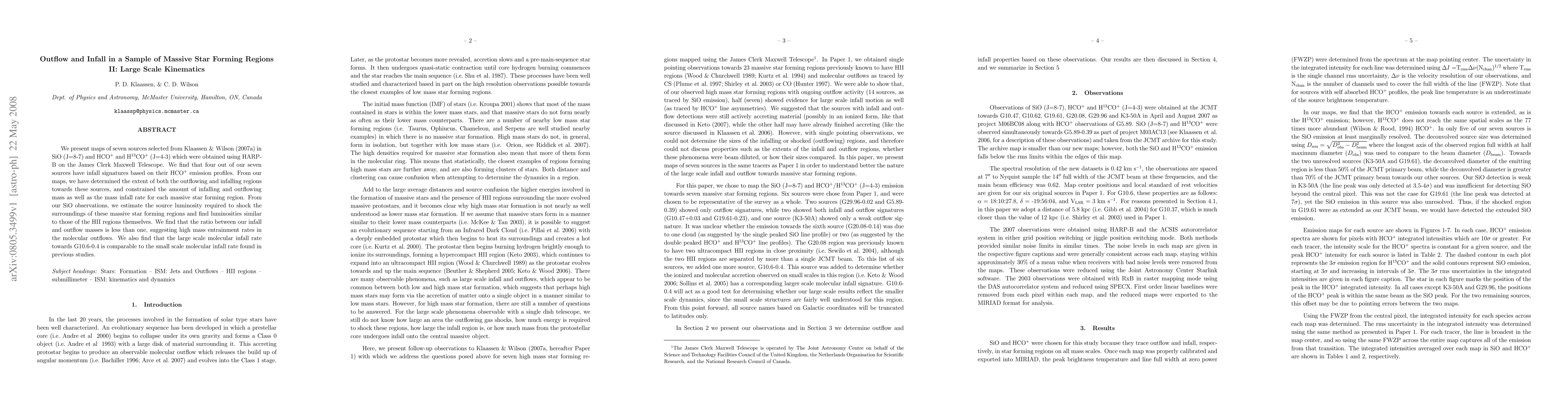 We present maps of seven sources selected from Klaassen & Wilson (2007a) in SiO (J=8-7) and HCO$^+$ and H$^{13}$CO$^+$ (J=4-3) which were obtained using HARP-B on the James Clerk Maxwell Telescope. We find that four out of our seven sources have infall signatures based on their HCO$^+$ emission profiles. From our maps, we have determined the extent of both the outflowing and infalling regions towards these sources, and constrained the amount of infalling and outflowing mass as well as the mass infall rate for each massive star forming region. From our SiO observations, we estimate the source luminosity required to shock the surroundings of these massive star forming regions and find luminosities similar to those of the HII regions themselves. We find that the ratio between our infall and outflow masses is less than one, suggesting high mass entrainment rates in the molecular outflows. We also find that the large scale molecular infall rate towards G10.6-0.4 is comparable to the small scale molecular infall rate found in previous studies.
