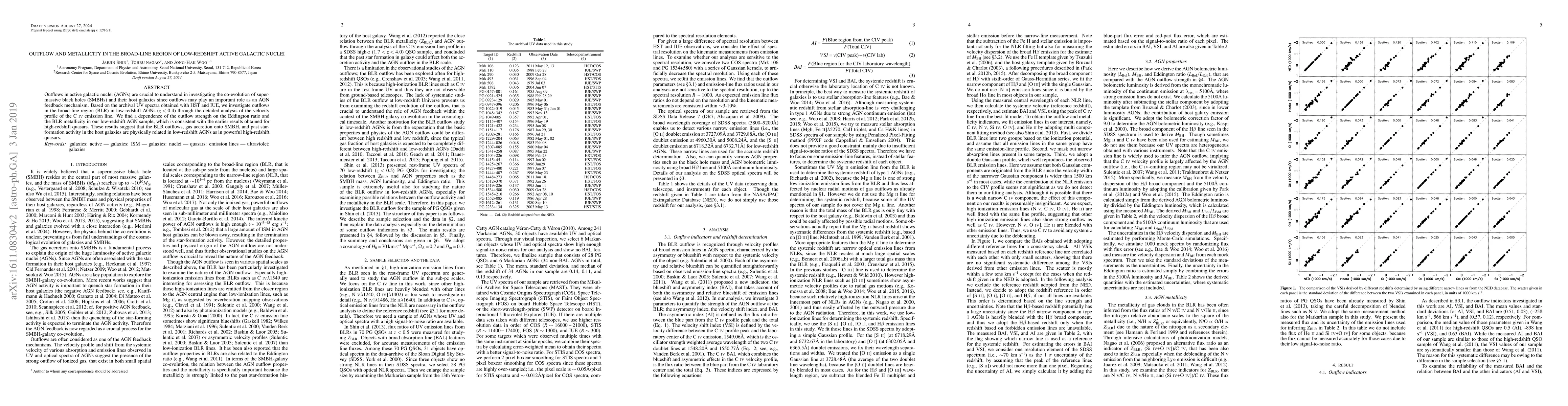 This study analyzes outflows in the broad-line region of low-redshift AGNs using archival UV spectra, finding a correlation between outflow strength and both the Eddington ratio and BLR metallicity. These findings suggest a similar physical relationship between BLR outflows, gas accretion onto SMBHs, and host galaxy star-formation activity as observed in high-redshift quasars.