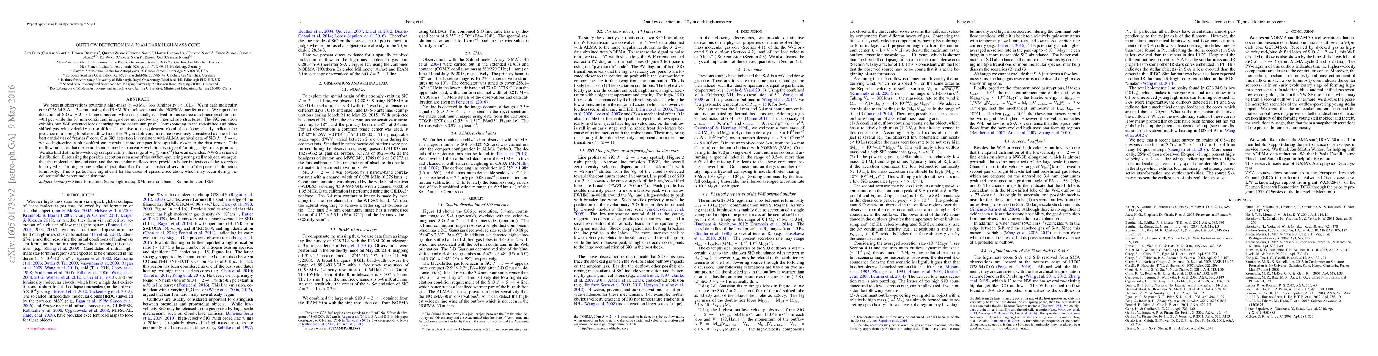 We present observations towards a high-mass ($\rm >40\,M_{\odot}$), low luminosity ($\rm <10\,L_{\odot}$) $\rm 70\,\mu$m dark molecular core G 28.34 S-A at 3.4 mm, using the IRAM 30 m telescope and the NOEMA interferometer. We report the detection of $\rm SiO$ $J=\rm 2\rightarrow1$ line emission, which is spatially resolved in this source at a linear resolution of $\sim$0.1 pc, while the 3.4 mm continuum image does not resolve any internal sub-structures. The SiO emission exhibits two W-E oriented lobes centring on the continuum peak. Corresponding to the red-shifted and blue-shifted gas with velocities up to $\rm 40\,km\,s^{-1}$ relative to the quiescent cloud, these lobes clearly indicate the presence of a strong bipolar outflow from this $\rm 70\,\mu$m dark core, a source previously considered as one of the best candidates of "starless" core. Our SiO detection is consistent with ALMA archival data of $\rm SiO$ $J=\rm 5\rightarrow4$, whose high-velocity blue-shifted gas reveals a more compact lobe spatially closer to the dust center. This outflow indicates that the central source may be in an early evolutionary stage of forming a high-mass protostar. We also find that the low-velocity components (in the range of $\rm V_{lsr}$$\rm_{-5}^{+3}\,km\,s^{-1}$) have an extended, NW-SE oriented distribution. Discussing the possible accretion scenarios of the outflow-powering young stellar object, we argue that the molecular line emission and the molecular outflows may provide a better indication of the accretion history when forming young stellar object, than that from a snapshot observations of the present bolometric luminosity. This is particularly significant for the cases of episodic accretion, which may occur during the collapse of the parent molecular core.