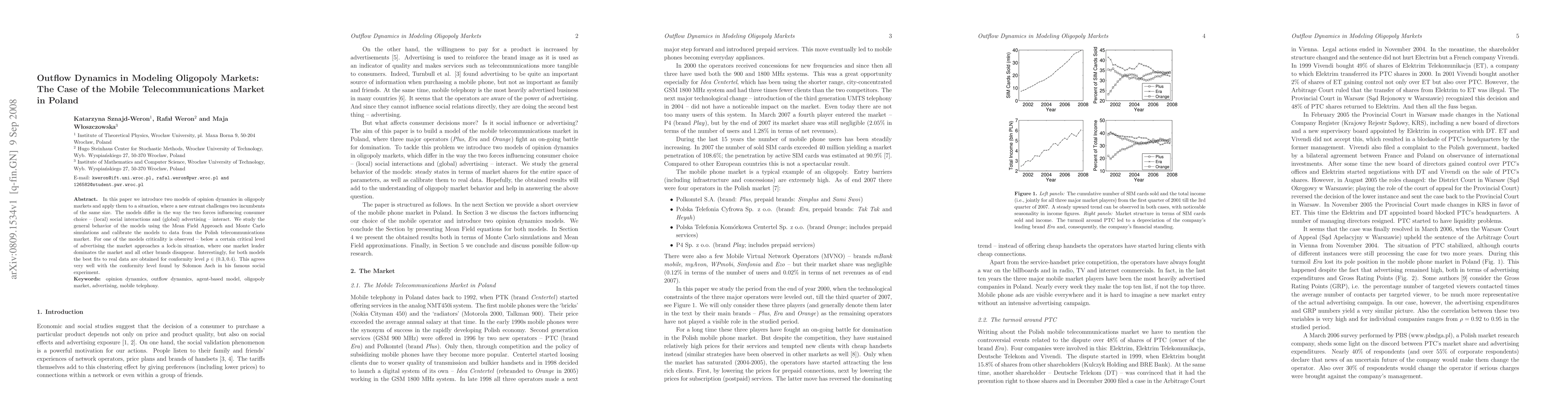 In this paper we introduce two models of opinion dynamics in oligopoly markets and apply them to a situation, where a new entrant challenges two incumbents of the same size. The models differ in the way the two forces influencing consumer choice -- (local) social interactions and (global) advertising -- interact. We study the general behavior of the models using the Mean Field Approach and Monte Carlo simulations and calibrate the models to data from the Polish telecommunications market. For one of the models criticality is observed -- below a certain critical level of advertising the market approaches a lock-in situation, where one market leader dominates the market and all other brands disappear. Interestingly, for both models the best fits to real data are obtained for conformity level $p \in (0.3,0.4)$. This agrees very well with the conformity level found by Solomon Asch in his famous social experiment.