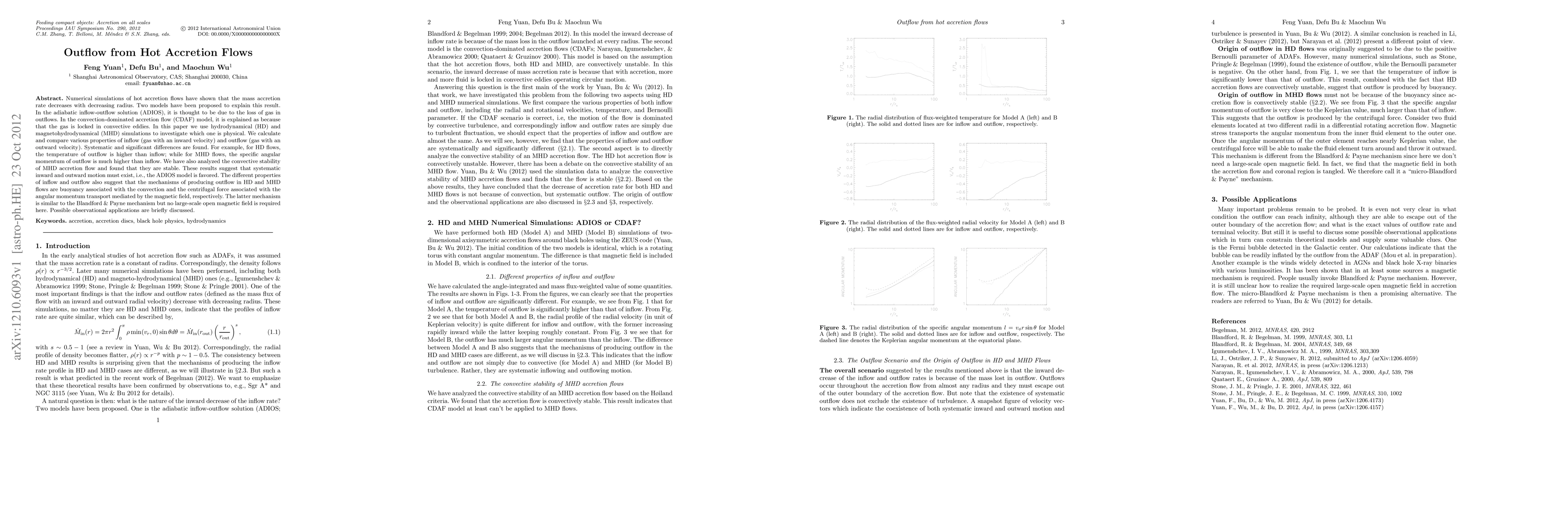 Numerical simulations show that hot accretion flows lose mass as they move outward, with properties of inflow and outflow differing between hydrodynamical and magnetohydrodynamical models, supporting the adiabatic inflow-outflow solution model.