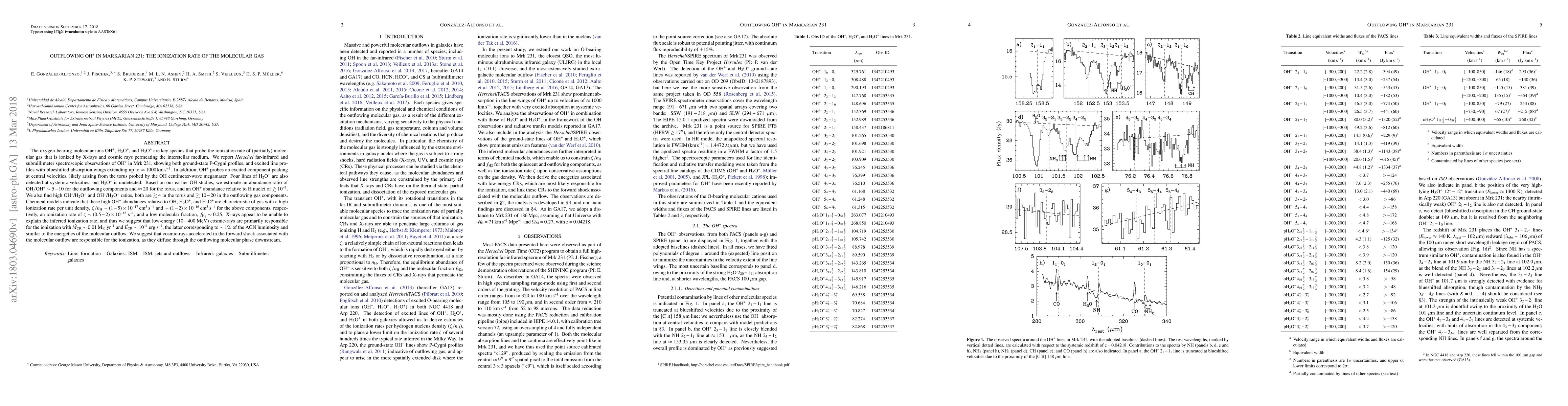 This paper reports Herschel observations of OH+ in Markarian 231, revealing high ionization rates of molecular gas, likely driven by low-energy cosmic rays rather than X-rays. The study finds that cosmic rays accelerated in the outflow's forward shock are responsible for the observed ionization, with an estimated ionization rate of 0.5-2x10^-12 s^-1.