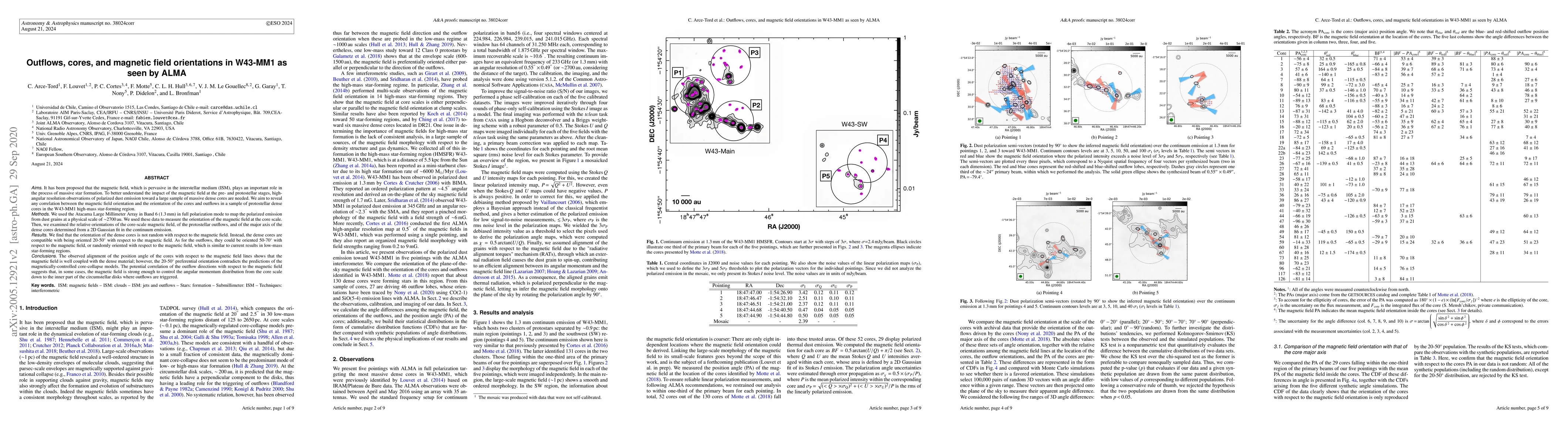 This study using ALMA reveals that in the massive protocluster W43-MM1, dense cores are preferentially oriented 20-50° relative to the magnetic field, while outflows may align 50-70° or randomly, suggesting magnetic field influence on angular momentum distribution.