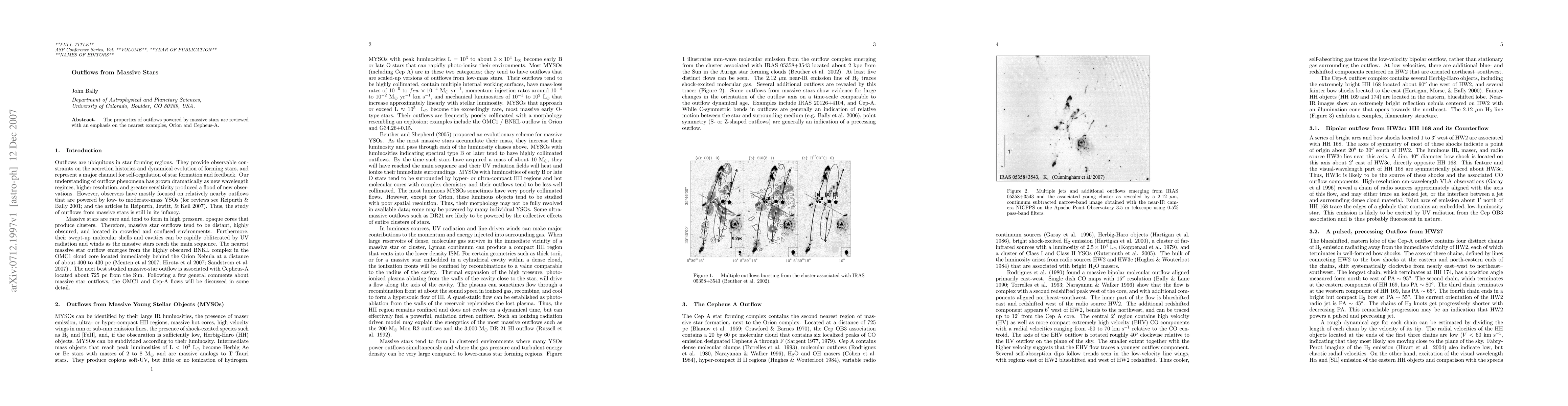 The properties of outflows powered by massive stars are reviewed with an emphasis on the nearest examples, Orion and Cepheus-A. The Orion OMC1 outflow may have been powered by the dynamical decay of a non-hierarchical massive star system that resulted in the ejection of the BN object, and poossibly radio soruces I and n from the OMC1 core. This interaction must have produced at least one massive binary whose gravitational binding energy ejected the stars and powered the outflow. A specific model for the coupling of this energy to the gas is proposed. The radio source HW2 in the Cep-A region appears to drive a pulsed, precessing jet that may be powered by a moderate-mass companion in an eccentric and inclined orbit. This configuration may be the result of binary formation by capture. These outflows demonstrate that dynamical interactions among massive stars are an important feature of massive star formation.