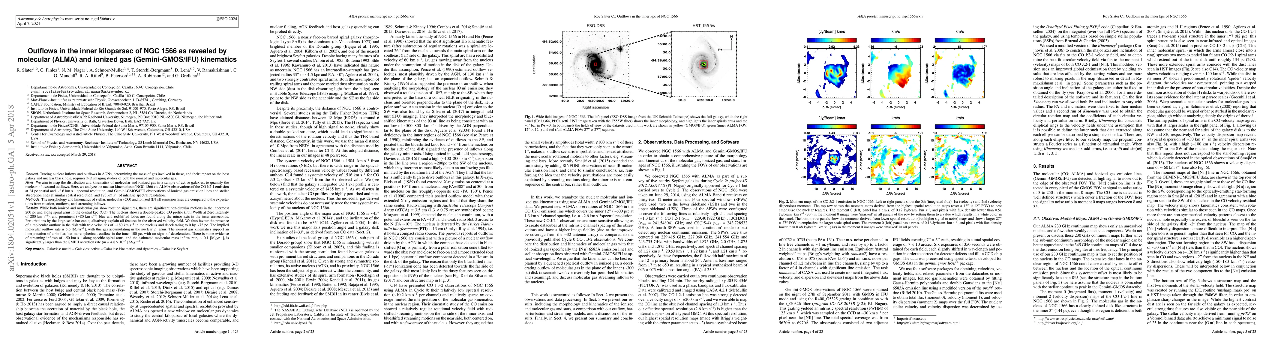 We aim to map the distribution and kinematics of molecular and ionized gas in a sample of active galaxies, to quantify the nuclear inflows and outflows. Here, we analyze the nuclear kinematics of NGC 1566 via ALMA observations of the CO J:2-1 emission at 24 pc spatial and $\sim$2.6 km s$^{-1}$ spectral resolution, and Gemini-GMOS/IFU observations of ionized gas emission lines and stellar absorption lines at similar spatial resolution, and 123 km s$^{-1}$ of intrinsic spectral resolution. The morphology and kinematics of stellar, molecular (CO) and ionized ([N II]) emission lines are compared to the expectations from rotation, outflows, and streaming inflows. While both ionized and molecular gas show rotation signatures, there are significant non-circular motions in the innermost 200 pc and along spiral arms in the central kpc (CO). The nucleus shows a double-peaked CO profile (Full Width at Zero Intensity of 200 km s$^{-1}$), and prominent ($\sim$80 km s$^{-1}$) blue and redshifted lobes are found along the minor axis in the inner arcseconds. Perturbations by the large-scale bar can qualitatively explain all features in the observed velocity field. We thus favour the presence of a molecular outflow in the disk with true velocities of $\sim$180 km s$^{-1}$ in the nucleus and decelerating to 0 by $\sim$72 pc. The implied molecular outflow rate is $5.6~[M_{o}yr^{-1}]$, with this gas accumulating in the nuclear 2 arcsec arms. The ionized gas kinematics support an interpretation of a similar, but more spherical, outflow in the inner 100 pc, with no signs of deceleration. There is some evidence of streaming inflows of $\sim$50 km s$^{-1}$ along specific spiral arms, and the estimated molecular mass inflow rate, $\sim0.1~[M_{o}yr^{-1}]$, is significantly larger than the SMBH accretion rate ($\dot{m}=4.8\times10^{-5}~[M_{o}yr^{-1}]$).