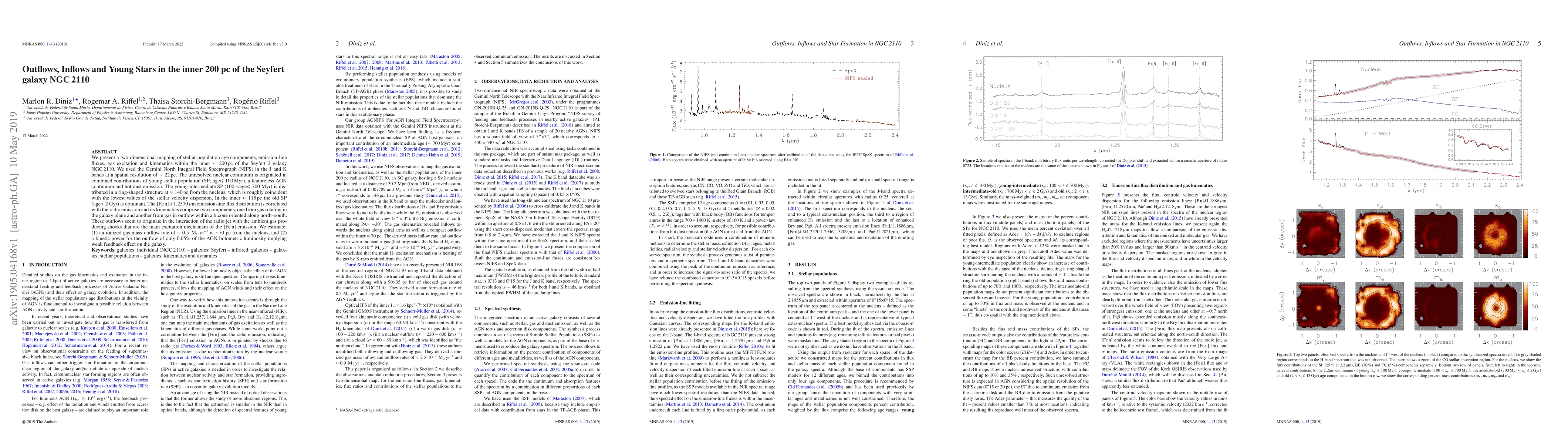 This study maps stellar populations, emission-line fluxes, and gas kinematics in the inner 200 pc of NGC 2110, revealing a ring of young stars and outflows of ionized gas likely driven by the interaction of a radio jet with ambient gas. The outflow's kinetic power is minimal, suggesting a weak feedback effect on the galaxy.