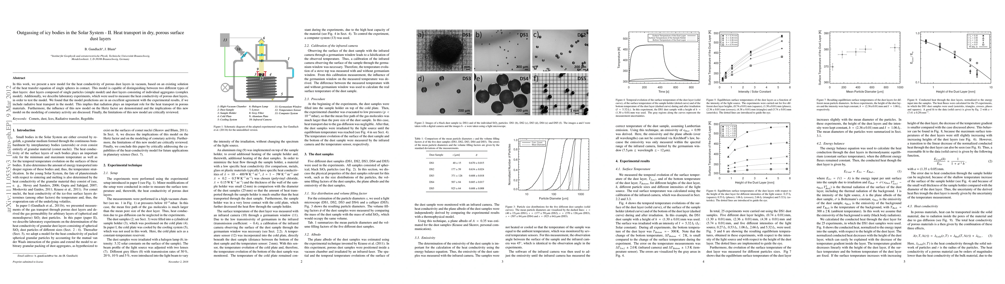 In this work, we present a new model for the heat conductivity of porous dust layers in vacuum, based on an existing solution of the heat transfer equation of single spheres in contact. This model is capable of distinguishing between two different types of dust layers: dust layers composed of single particles (simple model) and dust layers consisting of individual aggregates (complex model). Additionally, we describe laboratory experiments, which were used to measure the heat conductivity of porous dust layers, in order to test the model. We found that the model predictions are in an excellent agreement with the experimental results, if we include radiative heat transport in the model. This implies that radiation plays an important role for the heat transport in porous materials. Furthermore, the influence of this new model on the Hertz factor are demonstrated and the implications of this new model on the modeling of cometary activity are discussed. Finally, the limitations of this new model are critically reviewed.