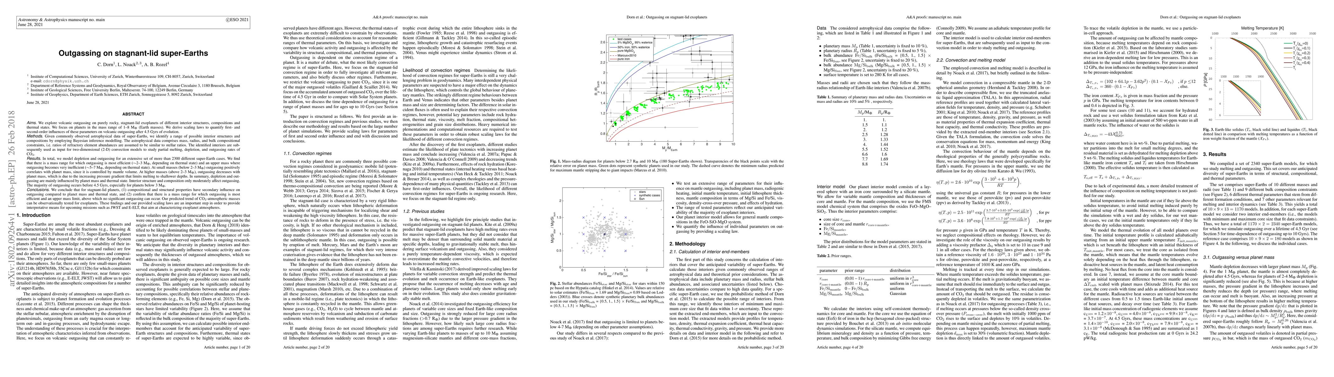 We explore volcanic outgassing on purely rocky, stagnant-lid exoplanets of different interior structures, compositions, thermal states, and age. We focus on planets in the mass range of 1-8 ME (Earth masses). We derive scaling laws to quantify first- and second-order influences of these parameters on volcanic outgassing after 4.5 Gyrs of evolution. Given commonly observed astrophysical data of super-Earths, we identify a range of possible interior structures and compositions by employing Bayesian inference modelling. [..] The identified interiors are subsequently used as input for two-dimensional (2-D) convection models to study partial melting, depletion, and outgassing rates of CO2. In total, we model depletion and outgassing for an extensive set of more than 2300 different super-Earth cases. We find that there is a mass range for which outgassing is most efficient (~2--3 ME, depending on thermal state) and an upper mass where outgassing becomes very inefficient (~5--7 \ME, depending on thermal state). [..] In summary, depletion and outgassing are mainly influenced by planet mass and thermal state. Interior structure and composition only moderately affect outgassing. The majority of outgassing occurs before 4.5 Gyrs, especially for planets below 3 ME. We conclude that for stagnant-lid planets, (1) compositional and structural properties have secondary influence on outgassing compared to planet mass and thermal state, and (2) confirm that there is a mass range for which outgassing is most efficient and an upper mass limit, above which no significant outgassing can occur. Our predicted trend of CO2-atmospheric masses can be observationally tested for exoplanets. These findings and our provided scaling laws are an important step in order to provide interpretative means for upcoming missions such as, e.g., JWST and E-ELT, that aim at characterizing exoplanet atmospheres.