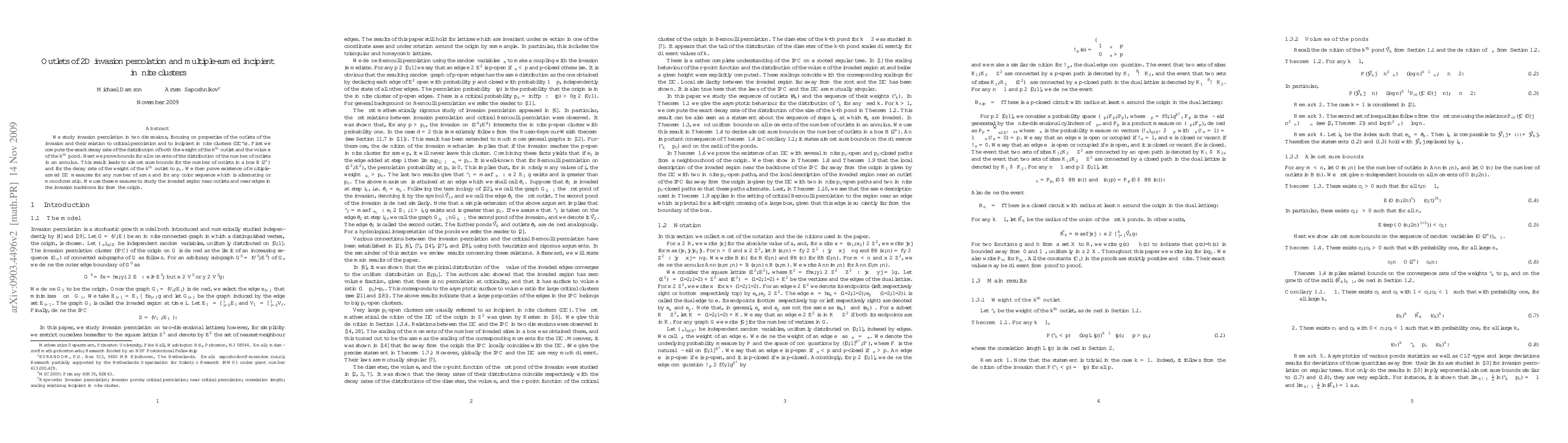 This research paper studies the invasion percolation in 2D, focusing on outlets of infinite clusters and their properties. It finds almost sure bounds for the number of outlets and decay rate, as well as existence of multiple-armed infinite cluster measures with specific color sequences.