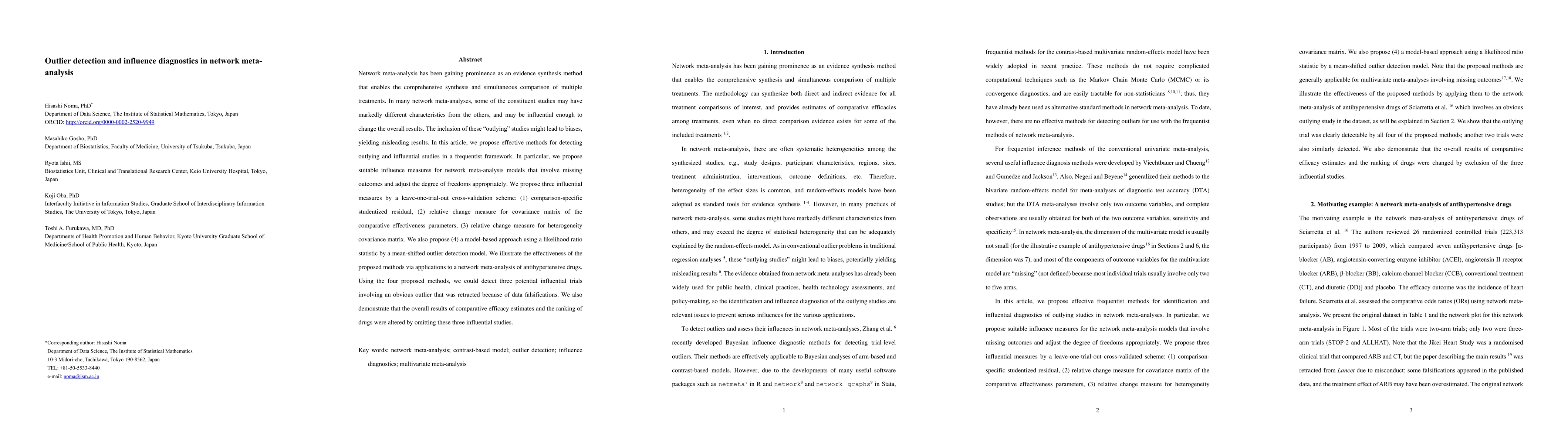 This paper proposes methods for detecting outlying and influential studies in network meta-analysis, which can bias results. It introduces four influence measures and demonstrates their effectiveness in identifying influential trials in a network meta-analysis of antihypertensive drugs, showing that omitting these trials alters comparative efficacy estimates and drug rankings.