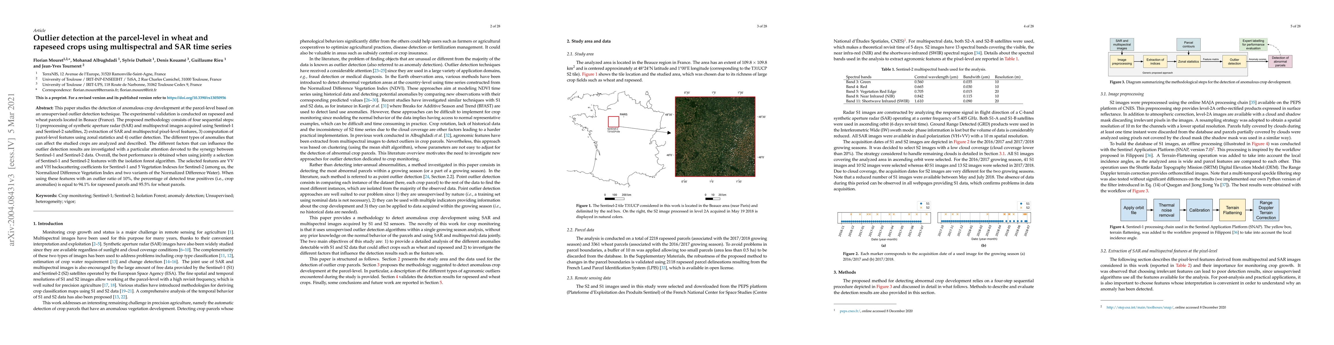 This study detects crop anomalies in wheat and rapeseed using multispectral and SAR time series data from Sentinel-1 and Sentinel-2 satellites, achieving high accuracy with a 94.1% true positive rate for rapeseed parcels.