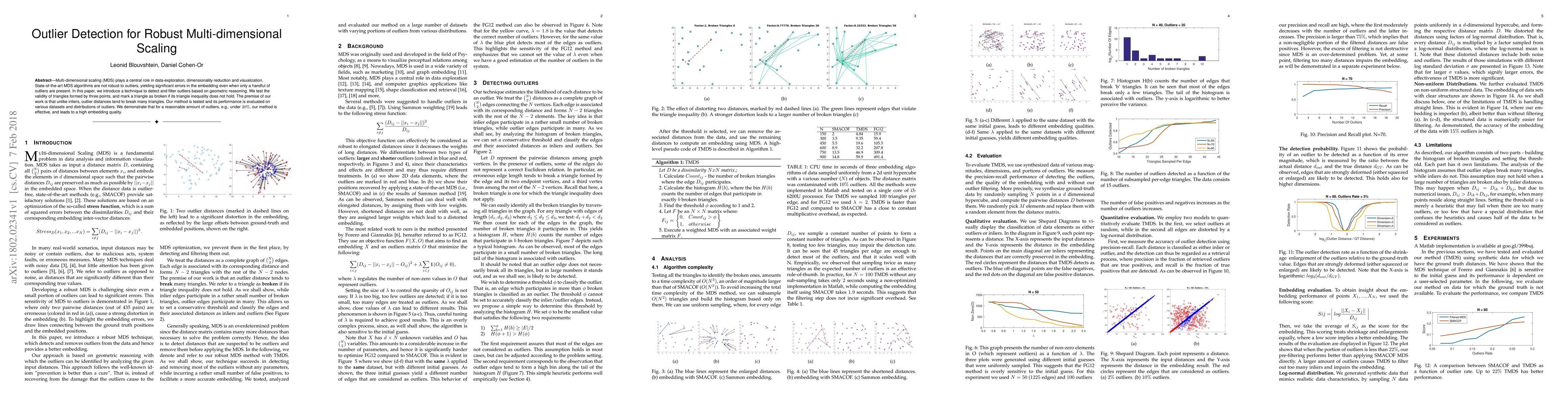This paper proposes a novel method for detecting and filtering outliers in multi-dimensional scaling (MDS) to enhance robustness. It leverages geometric reasoning by testing triangle inequalities to identify broken triangles, assuming outliers disrupt many triangles, and demonstrates improved embedding quality for datasets with up to 20% outliers.
