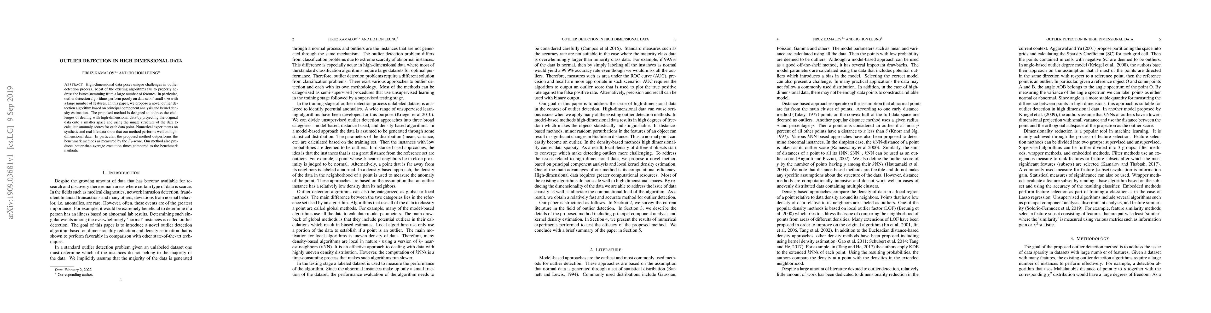 This paper proposes a novel outlier detection algorithm combining principal component analysis and kernel density estimation to tackle the challenges of high-dimensional data. The method projects data onto a lower-dimensional space and calculates anomaly scores, outperforming existing benchmarks in terms of $F_1$-score and execution time.