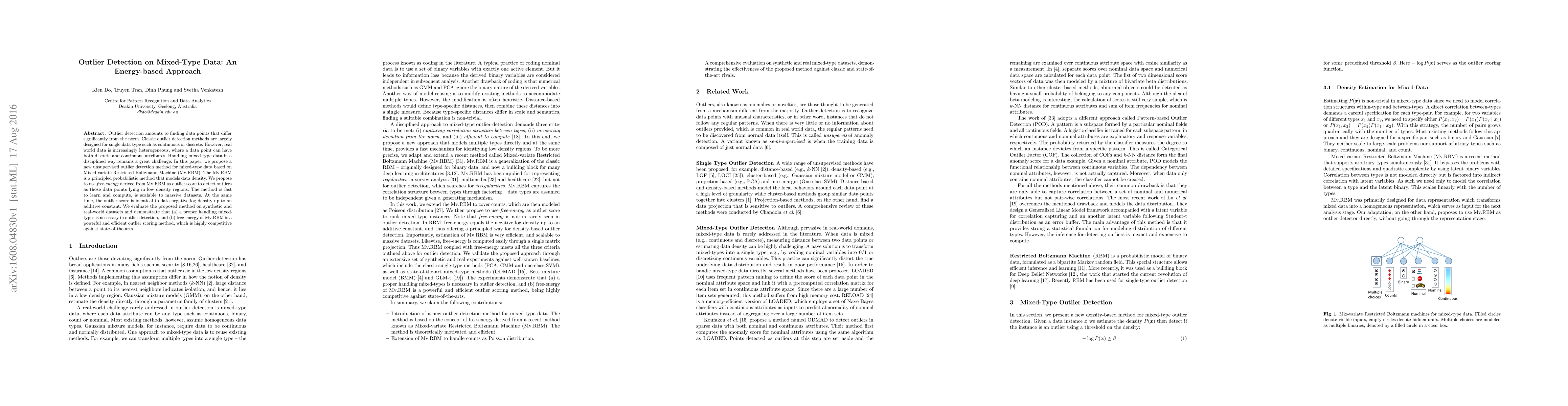 This paper introduces an unsupervised outlier detection method for mixed-type data using a Mixed-variate Restricted Boltzmann Machine (Mv.RBM) that models data density. The proposed method uses free-energy derived from Mv.RBM as an outlier score, demonstrating effectiveness and scalability on both synthetic and real-world datasets.