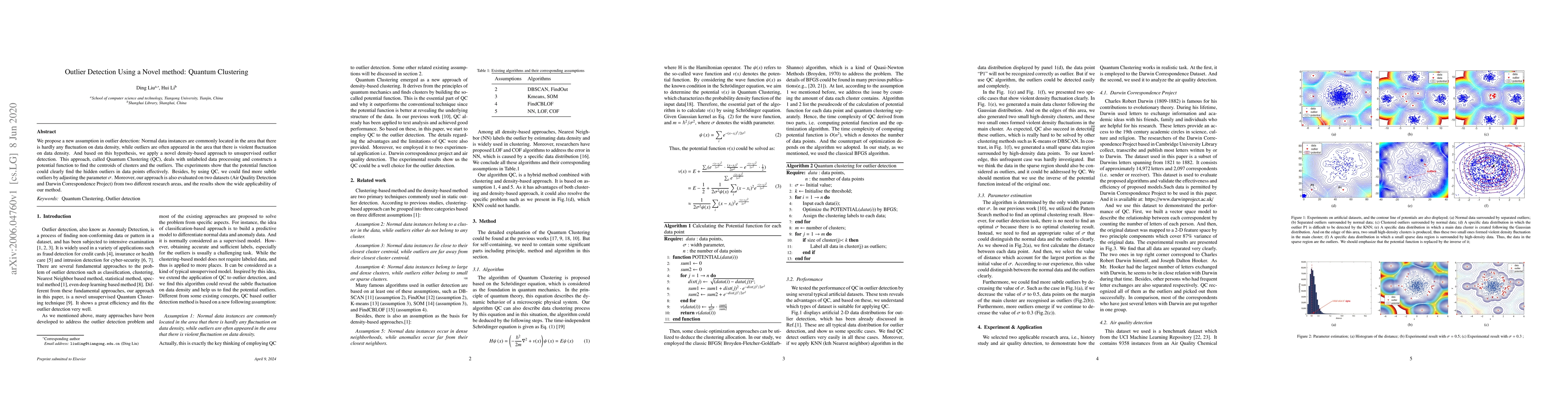 This paper proposes Quantum Clustering (QC), a novel density-based method for unsupervised outlier detection, based on the hypothesis that outliers occur in areas of high data density fluctuation. QC constructs a potential function to identify cluster centroids and outliers, demonstrating effective identification of subtle outliers and broad applicability across datasets.