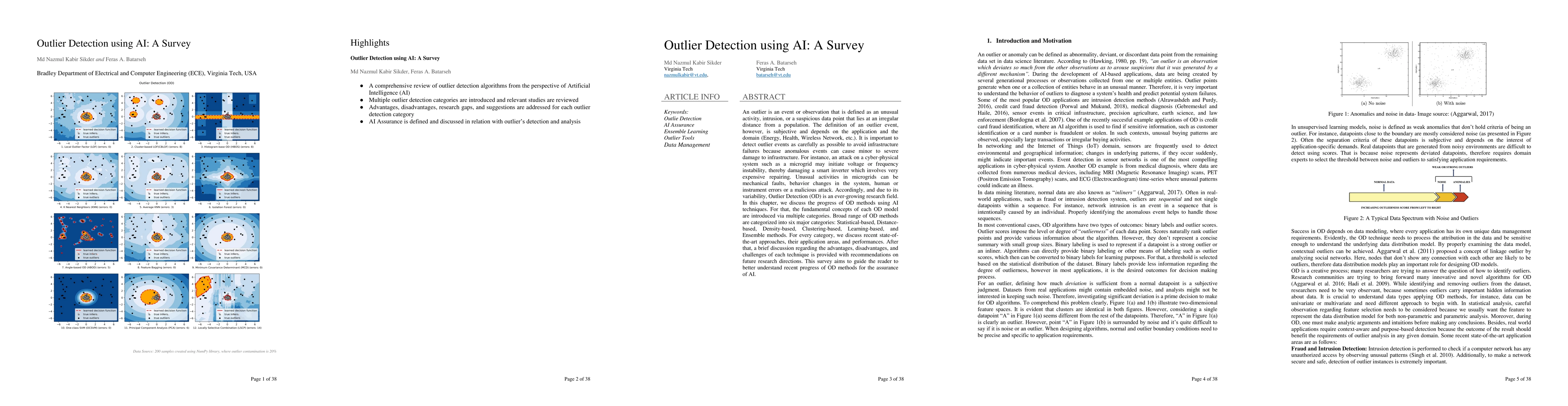 An outlier is an event or observation that is defined as an unusual activity, intrusion, or a suspicious data point that lies at an irregular distance from a population. The definition of an outlier event, however, is subjective and depends on the application and the domain (Energy, Health, Wireless Network, etc.). It is important to detect outlier events as carefully as possible to avoid infrastructure failures because anomalous events can cause minor to severe damage to infrastructure. For instance, an attack on a cyber-physical system such as a microgrid may initiate voltage or frequency instability, thereby damaging a smart inverter which involves very expensive repairing. Unusual activities in microgrids can be mechanical faults, behavior changes in the system, human or instrument errors or a malicious attack. Accordingly, and due to its variability, Outlier Detection (OD) is an ever-growing research field. In this chapter, we discuss the progress of OD methods using AI techniques. For that, the fundamental concepts of each OD model are introduced via multiple categories. Broad range of OD methods are categorized into six major categories: Statistical-based, Distance-based, Density-based, Clustering-based, Learning-based, and Ensemble methods. For every category, we discuss recent state-of-the-art approaches, their application areas, and performances. After that, a brief discussion regarding the advantages, disadvantages, and challenges of each technique is provided with recommendations on future research directions. This survey aims to guide the reader to better understand recent progress of OD methods for the assurance of AI.