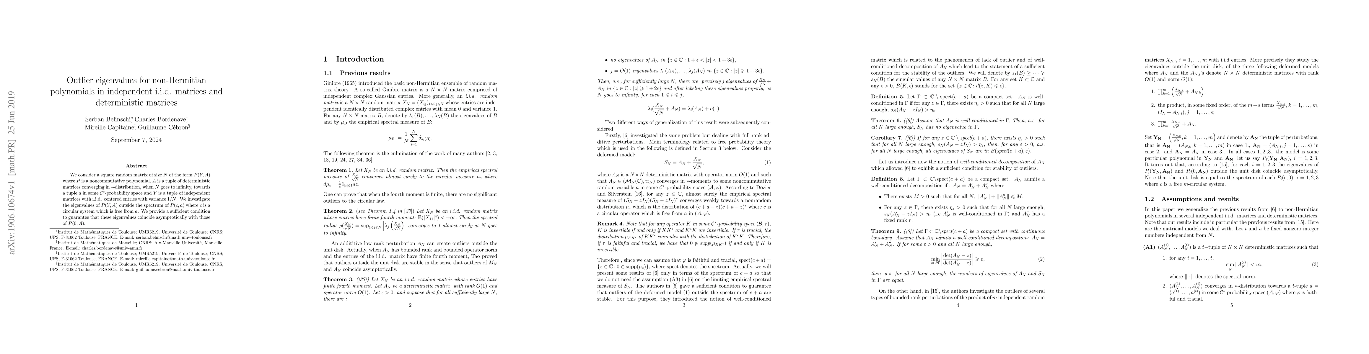 This paper studies the eigenvalues of non-Hermitian random matrices formed by noncommutative polynomials of deterministic and independent matrices. It provides a condition for the outlier eigenvalues to converge to those of a related deterministic matrix as the matrix size grows.