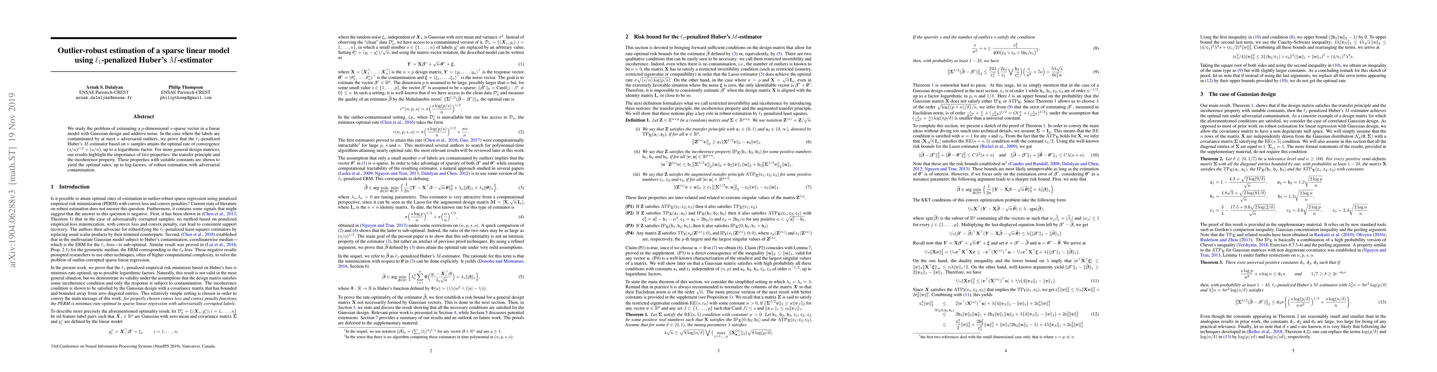 This paper investigates the estimation of an $s$-sparse vector in a linear model under Gaussian design and additive noise, focusing on the $\ell_1$-penalized Huber's $M$-estimator. It demonstrates that the estimator achieves optimal convergence rates even with up to $o$ adversarial outliers, highlighting the importance of the transfer principle and incoherence properties for robust estimation.