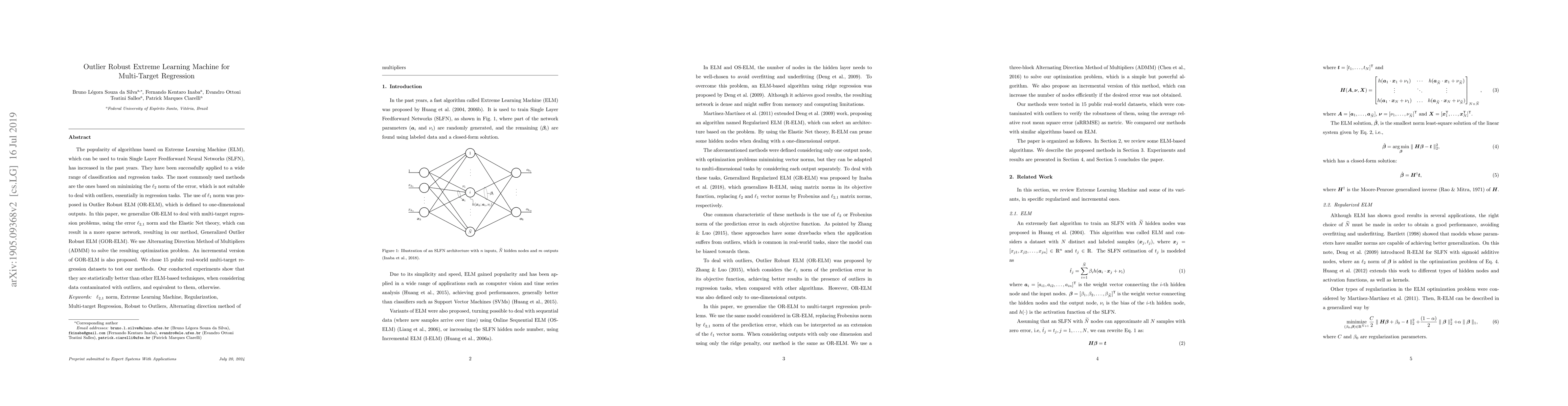 The popularity of algorithms based on Extreme Learning Machine (ELM), which can be used to train Single Layer Feedforward Neural Networks (SLFN), has increased in the past years. They have been successfully applied to a wide range of classification and regression tasks. The most commonly used methods are the ones based on minimizing the $\ell_2$ norm of the error, which is not suitable to deal with outliers, essentially in regression tasks. The use of $\ell_1$ norm was proposed in Outlier Robust ELM (OR-ELM), which is defined to one-dimensional outputs. In this paper, we generalize OR-ELM to deal with multi-target regression problems, using the error $\ell_{2,1}$ norm and the Elastic Net theory, which can result in a more sparse network, resulting in our method, Generalized Outlier Robust ELM (GOR-ELM). We use Alternating Direction Method of Multipliers (ADMM) to solve the resulting optimization problem. An incremental version of GOR-ELM is also proposed. We chose 15 public real-world multi-target regression datasets to test our methods. Our conducted experiments show that they are statistically better than other ELM-based techniques, when considering data contaminated with outliers, and equivalent to them, otherwise.