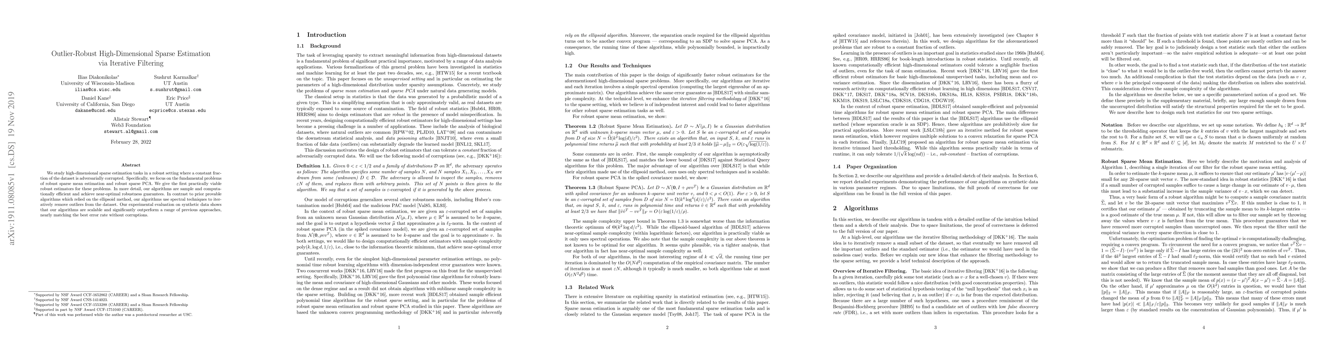 This paper presents robust estimators for high-dimensional sparse mean estimation and sparse PCA under adversarial corruption. It introduces efficient algorithms using spectral techniques to iteratively filter outliers, achieving near-optimal robustness and outperforming previous methods in scalability and error rate.
